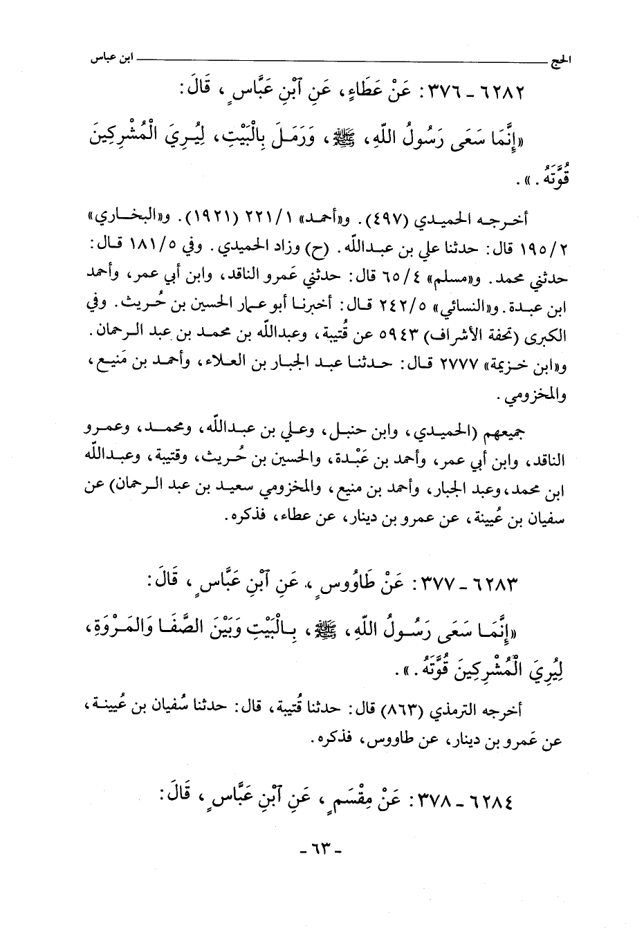 جميعهم (الحميدي، وأحمد بن حنبل، وعلي بن عبد الله، ومحمد، وعمرو الناقد، وابن أبي عمر، وأحمد بن عَبْدة، وأبو عمار , وقتيبة , وعبد الله بن محمد، وعبد الجبار، وأحمد بن منيع، والمخزومي سعيد بن عبد الرحمن) عن سفيان بن عُيينة، عن عمرو بن دينار، عن عطاء، فذكره.