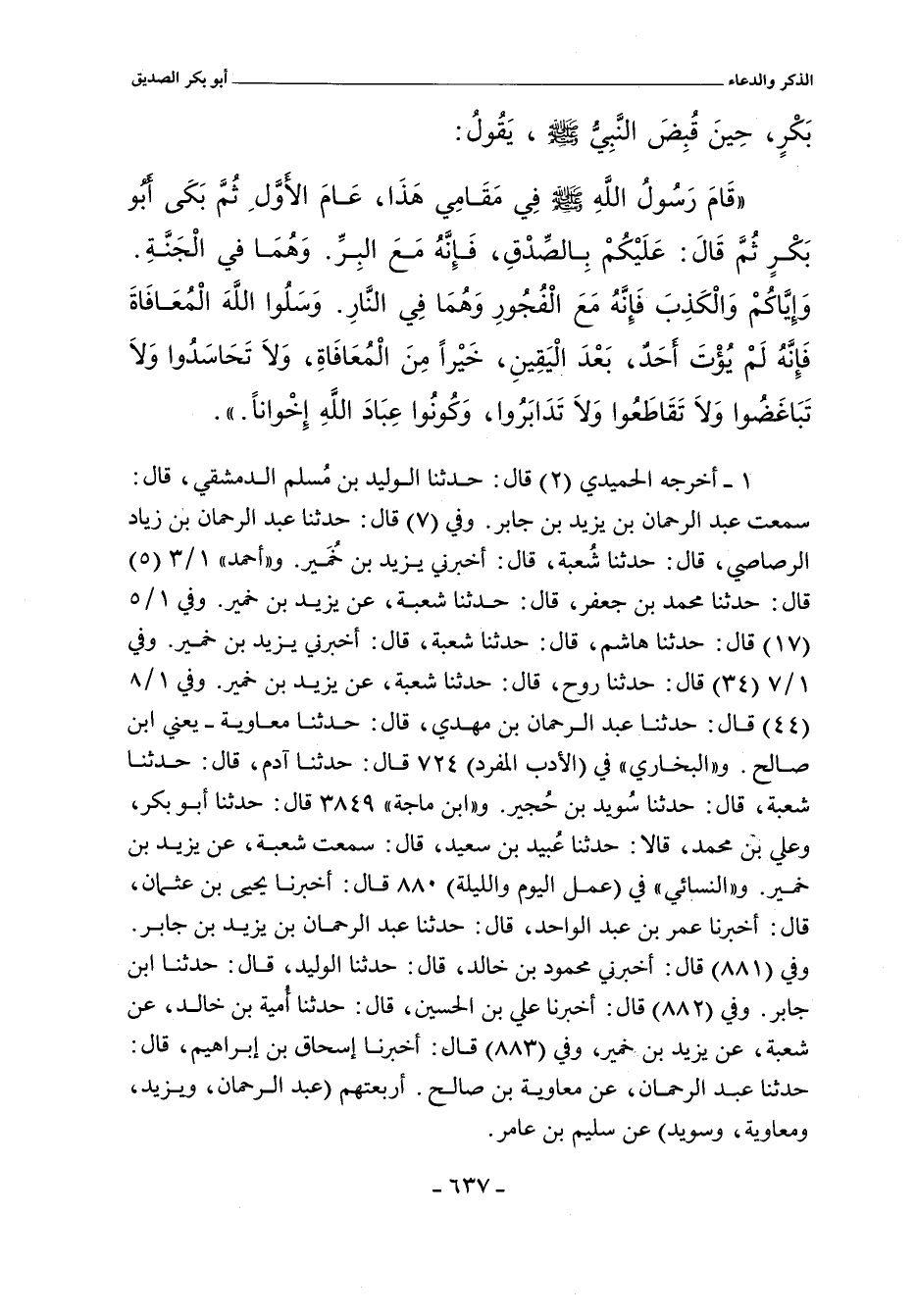 - وفي رواية: عَنْ أَوْسَطَ بْنِ عَمْرٍو، قَالَ: قَدِمْتُ الْمَدِينَةَ بَعْدَ وَفَاةِ رَسُولِ اللهِ صلى الله عليه وسلم بِسَنَةٍ، فَأَلْفَيْتُ أَبَا بَكْرٍ يَخْطُبُ النَّاسَ، فَقَالَ: قَامَ فِينَا رَسُولُ اللهِ صلى الله عليه وسلم عَامَ الأَوَّلِ، فَخَنَقَتْهُ الْعَبْرَةُ، ثَلَاثَ مِرَارٍ، ثُمَّ قَالَ: يَا أَيُّهَا النَّاسُ، سَلُوا اللهَ الْمُعَافَاةَ، فَإِنَّهُ لَمْ يُؤْتَ أَحَدٌ مِثْلَ يَقِينٍ بَعْدَ مُعَافَاةٍ، وَلَا أَشَدَّ مِنْ رِيبَةٍ بَعْدَ كُفْرٍ، وَعَلَيْكُمْ بِالصِّدْقِ، فَإِنَّهُ يَهْدِي إِلَى الْبِرِّ، وَهُمَا فِي الْجَنَّةِ، وَإِيَّاكُمْ وَالْكَذِبَ، فَإِنَّهُ يَهْدِي إِلَى الْفُجُورِ، وَهُمَا فِي النَّارِ.