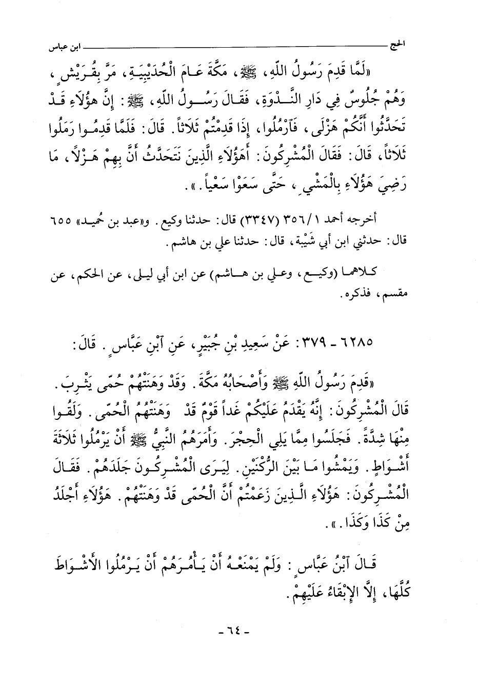 لَمَّا قَدِمَ رَسُولُ اللَّهِ صلى الله عليه وسلم مَكَّةَ عَامَ الْحُدَيْبِيَةِ مَرَّ بِقُرَيْشٍ وَهُمْ جُلُوسٌ فِى دَارِ النَّدْوَةِ فَقَالَ رَسُولُ اللَّهِ صلى الله عليه وسلم إِنَّ هَؤُلَاءِ قَدْ تَحَدَّثُوا أَنَّكُمْ هَزْلَى فَارْمُلُوا إِذَا قَدِمْتُمْ ثَلَاثًا قَالَ فَلَمَّا قَدِمُوا رَمَلُوا ثَلَاثًا قَالَ فَقَالَ الْمُشْرِكُونَ أَهَؤُلَاءِ الَّذِينَ نَتَحَدَّثُ أَنَّ بِهِمْ هُزْلاً مَا رَضِىَ هَؤُلَاءِ بِالْمَشْىِ حَتَّى سَعَوْا سَعْيًا.