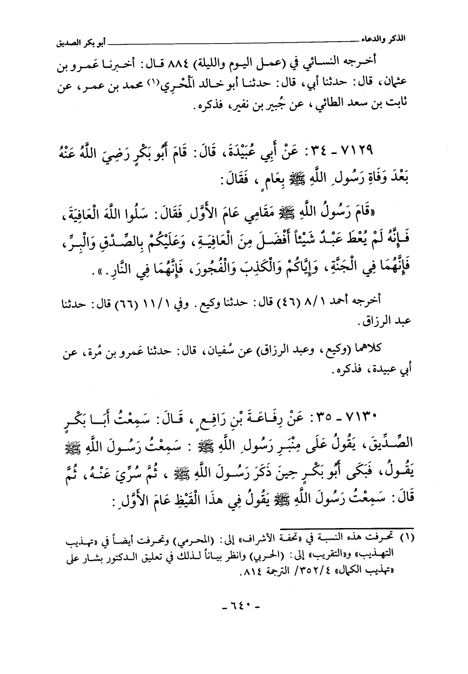 ٧١٢٩ - عَنْ أَبِي عُبَيْدَةَ، قَالَ: قَامَ أَبُو بَكْرٍ بَعْدَ وَفَاةِ رَسُولِ اللهِ صلى الله عليه وسلم بِعَامٍ، فَقَالَ: