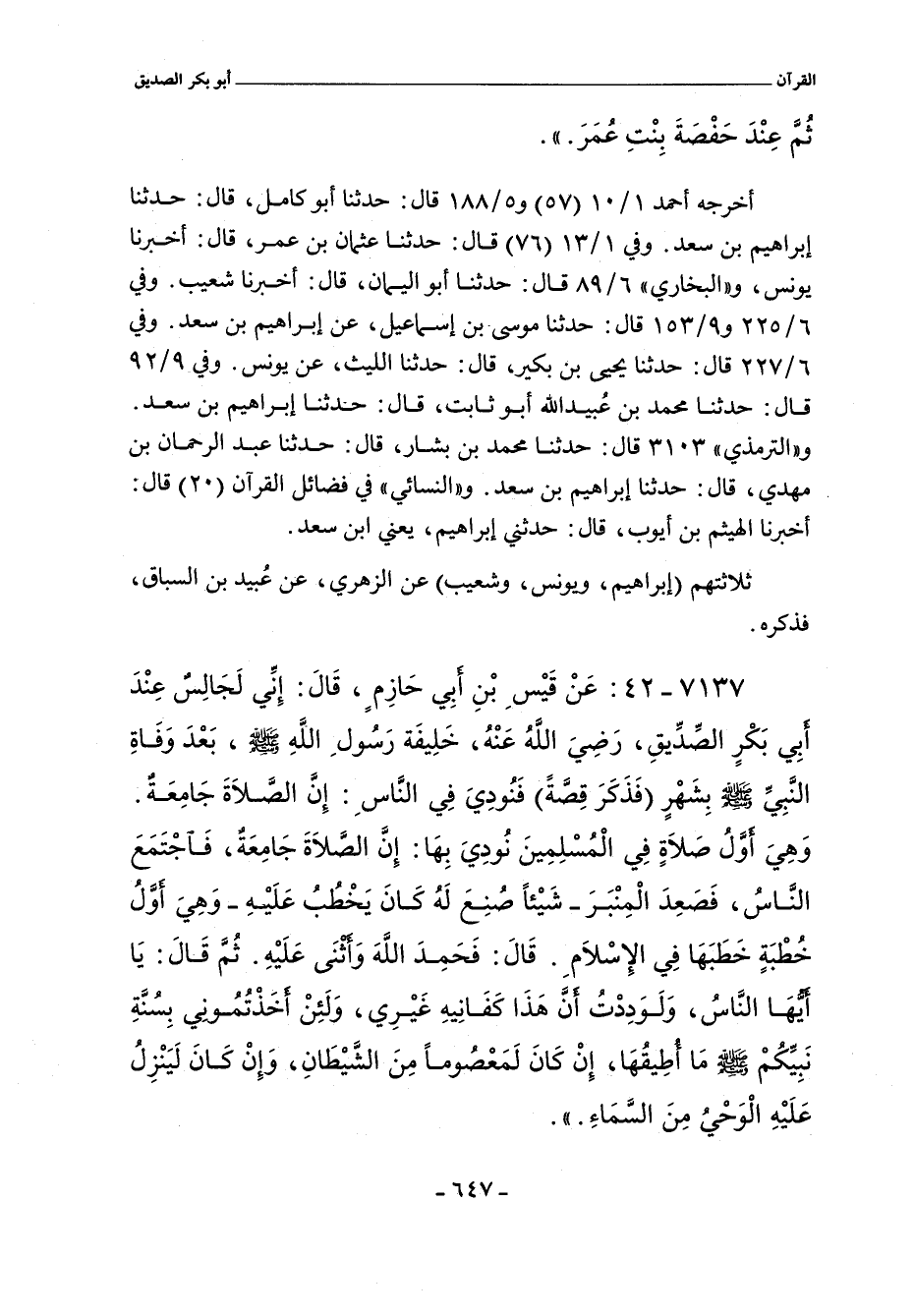 ٧١٣٧ - عَنْ قَيْسِ بْنِ أَبِي حَازِمٍ، قَالَ: إِنِّي لَجَالِسٌ عِنْدَ أَبِي بَكْرٍ الصِّدِّيقِ، خَلِيفَةِ رَسُولِ اللهِ صلى الله عليه وسلم بَعْدَ وَفَاةِ النَّبِيِّ صلى الله عليه وسلم بِشَهْرٍ، فَذَكَرَ قِصَّةً، فَنُودِيَ فِي النَّاسِ: أَنَّ الصَّلَاةَ جَامِعَةٌ، وَهِيَ أَوَّلُ صَلَاةٍ فِي الْمُسْلِمِينَ، نُودِي بِهَا إِنَّ الصَّلَاةَ جَامِعَةٌ، فَاجْتَمَعَ النَّاسُ فَصَعِدَ الْمِنْبَرَ، شَيْئًا صُنِعَ لَهُ كَانَ يَخْطُبُ عَلَيْهِ، وَهِيَ أَوَّلُ خُطْبَةٍ خَطَبَهَا فِي الإِسْلَامِ، قَالَ: فَحَمِدَ اللهَ وَأَثْنَى عَلَيْهِ، ثُمَّ قَالَ: يَا أَيُّهَا النَّاسُ، وَلَوَدِدْتُ أَنَّ هَذَا كَفَانِيهِ غَيْرِي، وَلَئِنْ أَخَذْتُمُونِي بِسُنَّةِ نَبِيِّكُمْ صلى الله عليه وسلم مَا أُطِيقُهَا إِنْ كَانَ لَمَعْصُومًا مِنَ الشَّيْطَانِ، وَإِنْ كَانَ لَيَنْزِلُ عَلَيْهِ الْوَحْيُ مِنَ السَّمَاءِ.