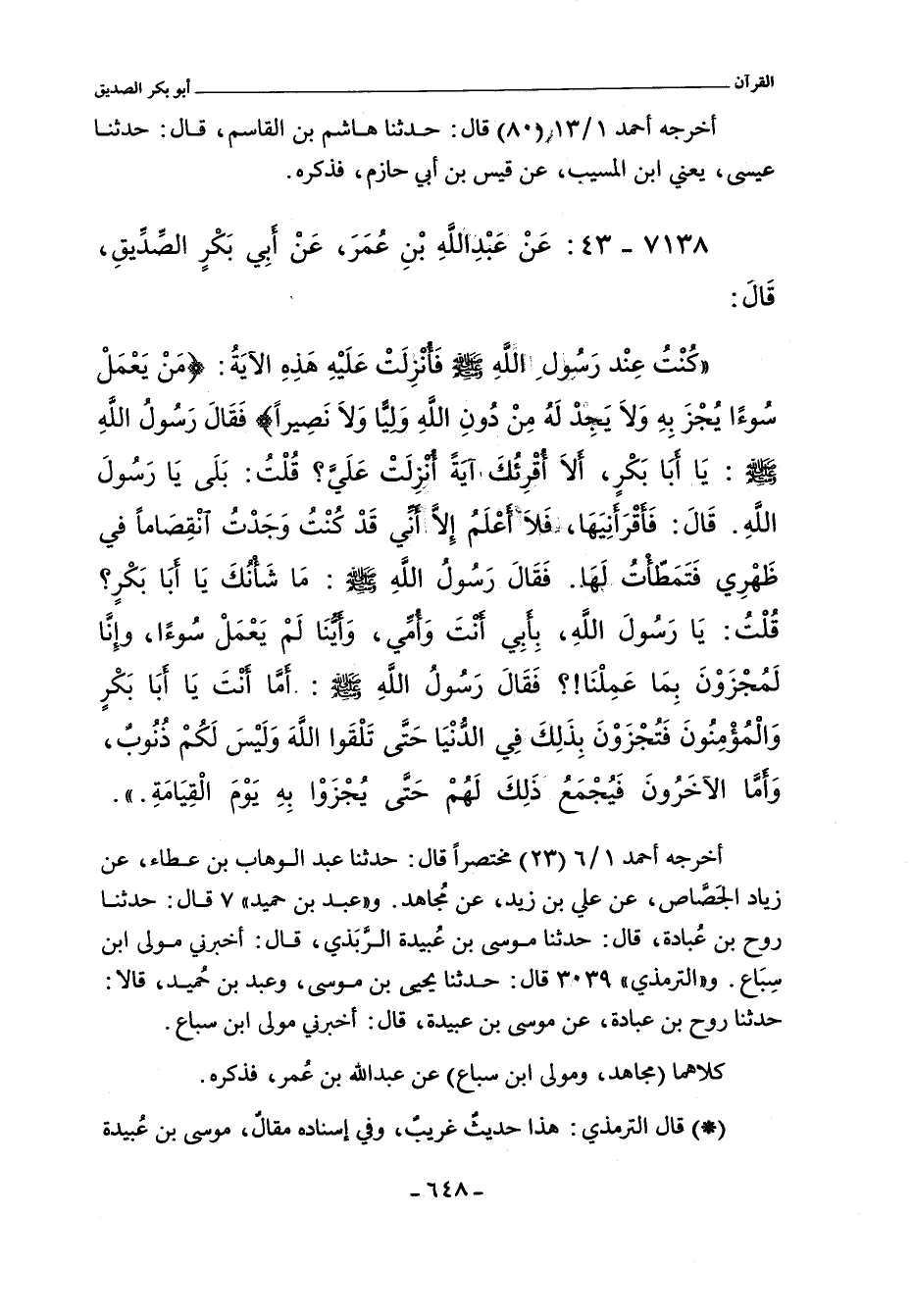كُنْتُ عِنْدَ رَسُولِ اللهِ صلى الله عليه وسلم، فَأُنْزِلَتْ عَلَيْهِ هَذِهِ الآيَةُ: (مَنْ يَعْمَلْ سُوءًا يُجْزَ بِهِ وَلَا يَجِدْ لَهُ مِنْ دُونِ اللهِ وَلِيًّا وَلَا نَصِيرًا) فَقَالَ رَسُولُ اللهِ صلى الله عليه وسلم: يَا أَبَا بَكْرٍ، أَلَا أُقْرِئُكَ آيَةً أُنْزِلَتْ عَلَيَّ؟ قُلْتُ: بَلَى يَا رَسُولَ اللهِ، قَالَ: فَأَقْرَأَنِيهَا، فَلَا أَعْلَمُ إِلَاّ أَنِّي قَدْ كُنْتُ وَجَدْتُ انْقِصَامًا فِي ظَهْرِي فَتَمَطَّأْتُ لَهَا، فَقَالَ رَسُولُ اللهِ صلى الله عليه وسلم: مَا شَأْنُكَ يَا أَبَا بَكْرٍ؟ قُلْتُ: يَا رَسُولَ اللهِ، بِأَبِي أَنْتَ وَأُمِّي، وَأَيُّنَا لَمْ يَعْمَلْ سُوءًا، وَإِنَّا لَمَجْزِيُّونَ بِمَا عَمِلْنَا؟ فَقَالَ رَسُولُ اللهِ صلى الله عليه وسلم: أَمَّا أَنْتَ يَا أَبَا بَكْرٍ وَالْمُؤْمِنُونَ فَتُجْزَوْنَ بِذَلِكَ فِي الدُّنْيَا حَتَّى تَلْقَوُا اللهَ وَلَيْسَ لَكُمْ ذُنُوبٌ، وَأَمَّا الآخَرُونَ فَيُجْمَعُ ذَلِكَ لَهُمْ حَتَّى يُجْزَوْا بِهِ يَوْمَ الْقِيَامَةِ.