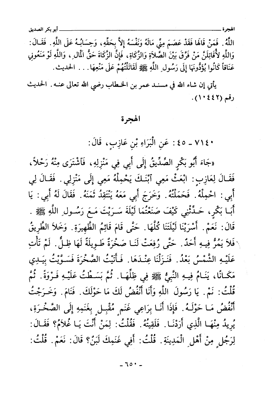 اشْتَرَى أَبُو بَكْرٍ مِنْ عَازِبٍ سَرْجًا بِثَلَاثَةَ عَشَرَ دِرْهَمًا، قَالَ: فَقَالَ أَبُو بَكْرٍ لِعَازِبٍ: مُرِ الْبَرَاءَ فَلْيَحْمِلْهُ إِلَى مَنْزِلِي، فَقَالَ: لَا حَتَّى تُحَدِّثَنَا كَيْفَ صَنَعْتَ حِينَ خَرَجَ رَسُولُ اللهِ صلى الله عليه وسلم وَأَنْتَ مَعَهُ، قَالَ: فَقَالَ أَبُو بَكْرٍ: خَرَجْنَا فَأَدْلَجْنَا، فَأَحْثَثْنَا يَوْمَنَا وَلَيْلَتَنَا حَتَّى أَظْهَرْنَا وَقَامَ قَائِمُ الظَّهِيرَةِ، فَضَرَبْتُ بِبَصَرِي هَلْ أَرَى ظِلاًّ نَأْوِي إِلَيْهِ، فَإِذَا أَنَا بِصَخْرَةٍ، فَأَهْوَيْتُ إِلَيْهَا، فَإِذَا بَقِيَّةُ ظِلِّهَا، فَسَوَّيْتُهُ لِرَسُولِ الله صلى الله عليه وسلم، وَفَرَشْتُ لَهُ فَرْوَةً، وَقُلْتُ: اضْطَجِعْ يَا رَسُولَ اللهِ، فَاضْطَجَعَ، ثُمَّ خَرَجْتُ أَنْظُرُ هَلْ أَرَى أَحَدًا مِنَ الطَّلَبِ، فَإِذَا أَنَا بِرَاعِي غَنَمٍ، فَقُلْتُ: لِمَنْ أَنْتَ يَا غُلَامُ؟ فَقَالَ: لِرَجُلٍ مِنْ قُرَيْشٍ، فَسَمَّاهُ فَعَرَفْتُهُ، فَقُلْتُ: هَلْ فِي غَنَمِكَ مِنْ لَبَنٍ؟ قَالَ: نَعَمْ، قَالَ: قُلْتُ: هَلْ أَنْتَ حَالِبٌ لِى؟ قَالَ: نَعَمْ، قَالَ: فَأَمَرْتُهُ فَاعْتَقَلَ شَاةً مِنْهَا، ثُمَّ أَمَرْتُهُ فَنَفَضَ ضَرْعَهَا مِنَ الْغُبَارِ، ثُمَّ أَمَرْتُهُ فَنَفَضَ كَفَّيْهِ مِنَ الْغُبَارِ، وَمَعِي إِدَاوَةٌ عَلَى فَمِهَا خِرْقَةٌ، فَحَلَبَ لِي كُثْبَةً مِنَ اللَّبَنِ، فَصَبَبْتُ عَلَى الْقَدَحِ حَتَّى بَرَدَ أَسْفَلُهُ، ثُمَّ أَتَيْتُ رَسُولَ اللهِ صلى الله عليه وسلم فَوَافَيْتُهُ وَقَدِ اسْتَيْقَظَ، فَقُلْتُ: اشْرَبْ يَا رَسُولَ اللهِ، فَشَرِبَ حَتَّى رَضِيتُ، ثُمَّ قُلْتُ: هَلْ أَنَى الرَّحِيلُ؟ قَالَ: فَارْتَحَلْنَا وَالْقَوْمُ يَطْلُبُونَا، فَلَمْ