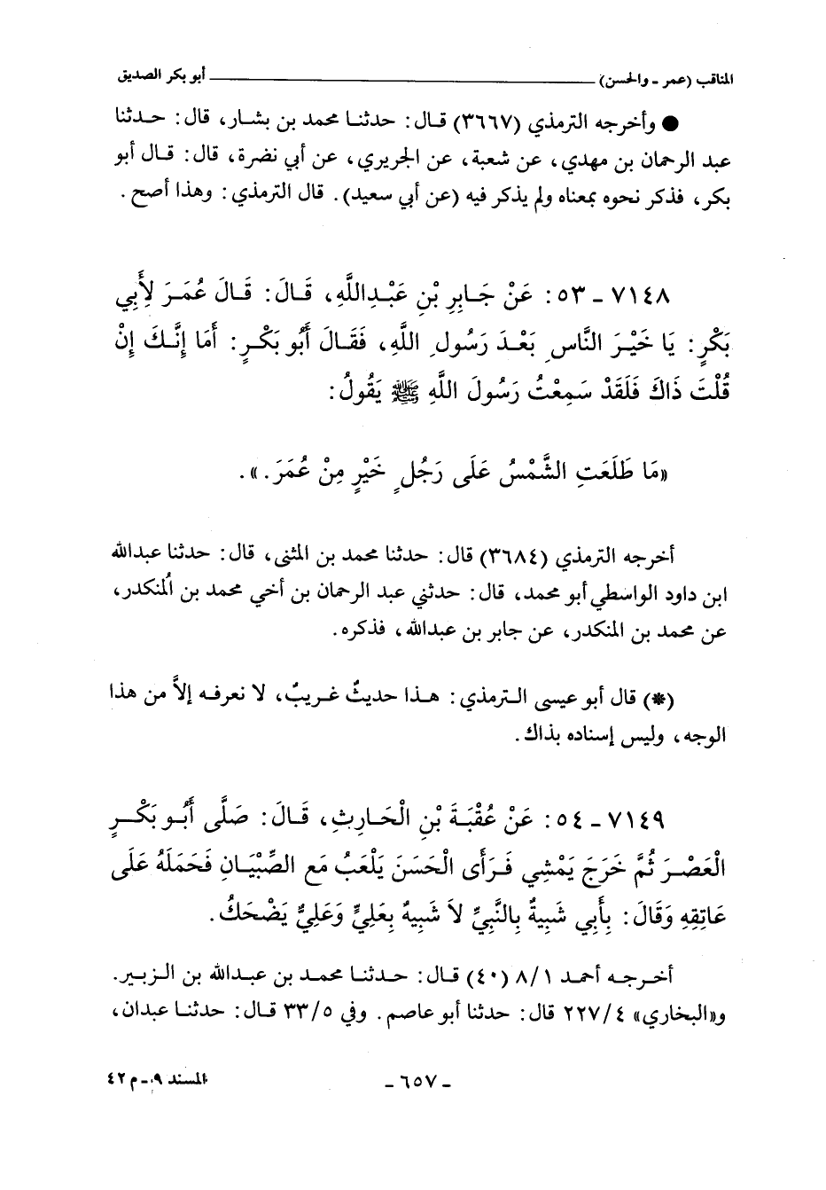 ٧١٤٨ - عَنْ جَابِرِ بْنِ عَبْدِ اللهِ، قَالَ: قَالَ عُمَرُ لأَبِي بَكْرٍ: يَا خَيْرَ النَّاسِ بَعْدَ رَسُولِ اللهِ، فَقَالَ أَبُو بَكْرٍ: أَمَا إِنَّكَ إِنْ قُلْتَ ذَاكَ، فَلَقَدْ سَمِعْتُ رَسُولَ اللهِ صلى الله عليه وسلم يَقُولُ:
