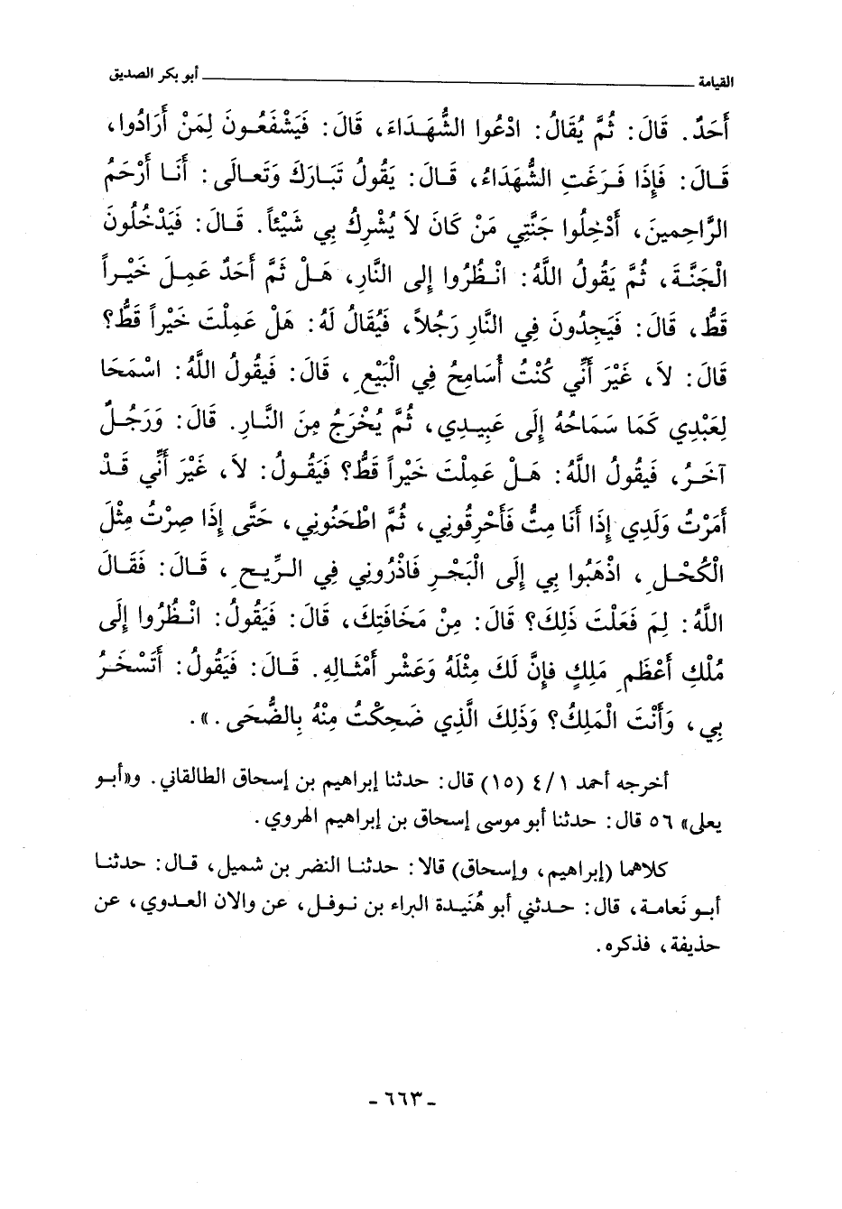 أَحَدٌ، ثُمَّ يُقَالُ: ادْعُوا الشُّهَدَاءَ فَيَشْفَعُونَ لِمَنْ أَرَادُوا، قَالَ: فَإِذَا فَعَلَتِ الشُّهَدَاءُ ذَلِكَ، قَالَ: يَقُولُ اللهُ، عَزَّ وَجَلَّ: أَنَا أَرْحَمُ الرَّاحِمِينَ، أَدْخِلُوا جَنَّتِي مَنْ كَانَ لَا يُشْرِكُ بِي شَيْئًا، قَالَ: فَيَدْخُلُون الْجَنَّةَ، قَالَ: ثُمَّ يَقُولُ اللهُ، عَزَّ وَجَلَّ: انْظُرُوا فِي النَّارِ، هَلْ تَلْقَوْنَ مِنْ أَحَدٍ عَمِلَ خَيْرًا قَطُّ، قَالَ: فَيَجِدُونَ فِي النَّارِ رَجُلاً، فَيَقُولُ لَهُ: هَلْ عَمِلْتَ خَيْرًا قَطُّ؟ فَيَقُولُ: لَا، غَيْرَ أَنِّي كُنْتُ أُسَامِحُ النَّاسَ فِي الْبَيْعِ وَالشِّرَاءِ، فَيَقُولُ اللهُ، عَزَّ وَجَلَّ: أَسْمَحُوا لِعَبْدِي كَإِسْمَاحِهِ إِلَى عَبِيدِي وَأَكْثَرَ، ثُمَّ يُخْرِجُون مِنَ النَّارِ رَجُلاً، فَيَقُولُ لَهُ: هَلْ عَمِلْتَ خَيْرًا قَطُّ؟ فَيَقُولُ: لَا، غَيْرَ أَنِّي قَدْ أَمَرْتُ وَلَدِي إِذَا مِتُّ فَأَحْرِقُونِي بِالنَّارِ، ثُمَّ اطْحَنُونِي، حَتَّى إِذَا كُنْتُ مِثْلَ الْكُحْلِ، فَاذْهَبُوا بِي إِلَى الْبَحْرِ، فَاذْرُونِي فِي الرِّيحِ، فَوَاللهِ لا يَقْدِرُ عَلَيَّ رَبُّ الْعَالَمِينَ أَبَدًا، فَقَالَ اللهُ، عَزَّ وَجَلَّ: لِمَ فَعَلْتَ ذَلِكَ؟ قَالَ: مِنْ مَخَافَتِكَ، قَالَ: فَيَقُولُ اللهُ، عَزَّ وَجَلَّ: انْظُرْ إِلَى مُلْكِ أَعْظَمِ مَلِكٍ، فَإِنَّ لَكَ مِثْلَهُ وَعَشَرَةَ أَمْثَالِهِ، قَالَ: فَيَقُولُ: لِمَ تَسْخَرُ بِي وَأَنْتَ الْمَلِكُ؟ قَالَ: وَذَاكَ الَّذِي ضَحِكْتُ