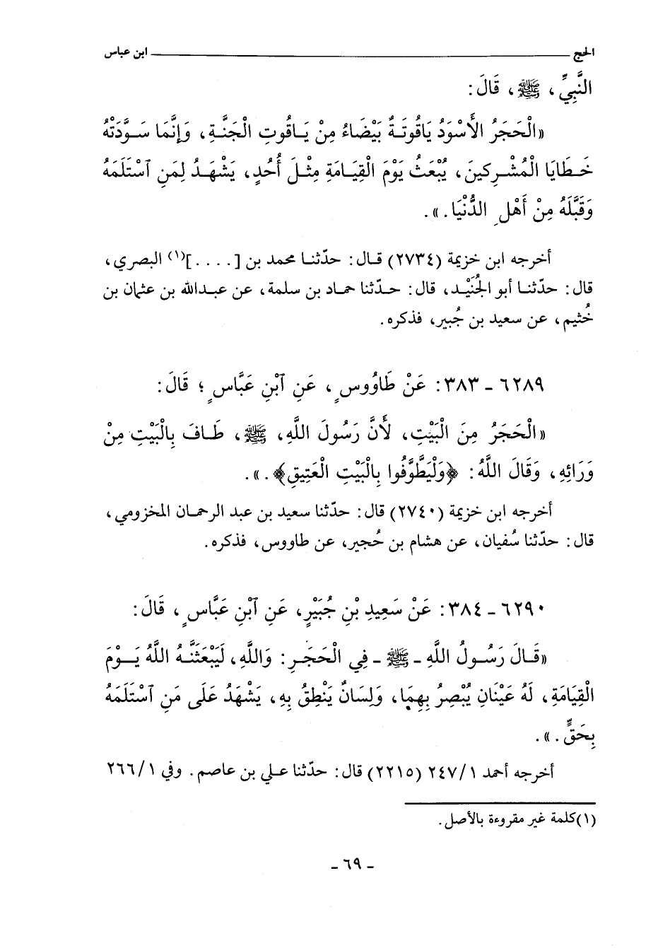 - وفي رواية: إنَّ لِهَذَا الْحَجَرِ لِسَانًا وَشَفَتَيْنِ يَشْهَدُ لِمَنِ اسْتَلَمَهُ يَوْمَ الْقِيَامَةِ بِحَقٍّ.
