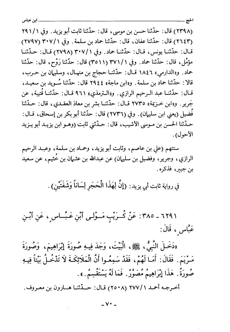 (٢٣٩٨) قال: حدثنا حسن بن موسى , قال: حدثنا ثابت أبو يزيد. وفي ١/ ٢٩١ (٢٦٤٣) قال: حدثنا عفان، حدثنا حماد بن سلمة. وفي ١/ ٣٠٧ (٢٧٩٧) قال: حدثنا يونس، حدثنا حماد بن سلمة. وفي ١/ ٣٠٧ (٢٧٩٧) قال: حدثنا مؤمَّل، حدثنا حماد. وفي ١/ ٣٧١ (٣٥١١) قال: حدثنا رَوْح، حدثنا حماد. و"الدارِمِي" ١٨٣٩ قال: حدثنا حجاج بن منهال، وسليمان بن حرب، قالا: حدثنا حماد بن سلمة. و"ابن ماجة" ٢٩٤٤ قال: حدثنا سُويد بن سعيد، حدثنا عبد الرحيم الرازي. والتِّرْمِذِيّ" ٩٦١ قال: حدثنا قُتيبة، عن جَرير. و"ابن خزيمة" ٢٧٣٥ قال: حدثنا بشر بن معاذ العقدي، حدثنا فُضيل , يعني ابن سليمان. وفي (٢٧٣٦) قال: حدثنا أبو بكر بن إسحاق، حدثنا الحسن بن موسى الاشيب، حدثني ثابت , وهو ابن يزيد أبو يزيد الاحول.