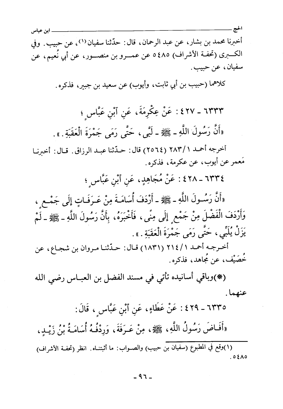 أَنَّ رَسُولَ اللهِ صلى الله عليه وسلم أَرْدَفَ أُسَامَةَ مِنْ عَرَفَاتٍ إِلَى جَمْعٍ، وَأَرْدَفَ الْفَضْلَ مِنْ جَمْعٍ إِلَى مِنًى، فَأَخْبَرَهُ بِأَنَّ رَسُولَ اللهِ صلى الله عليه وسلم لَمْ يَزَلْ يُلَبِّي، حَتَّى رَمَى الْجَمْرَةَ.