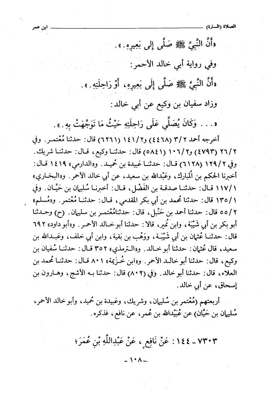- وفي رواية: أَنَّ النَّبِىَّ صلى الله عليه وسلم صَلَّى إِلَى بَعِيرِهِ أَوْ رَاحِلَتِهِ وَكَانَ يُصَلِّى عَلَى رَاحِلَتِهِ حَيْثُمَا تَوَجَّهَتْ بِهِ.