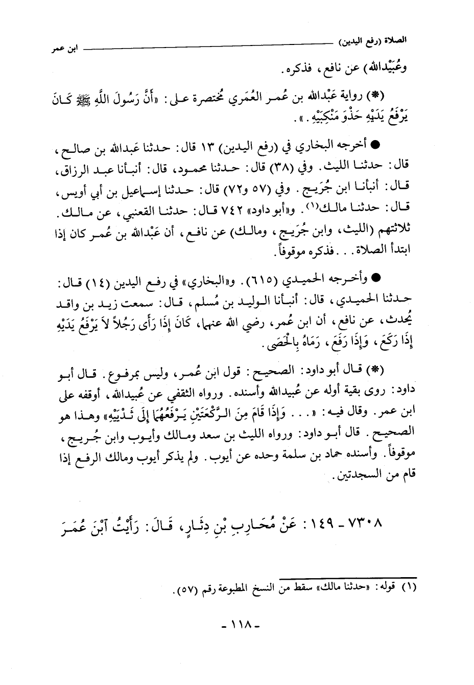 أربعتهم (مالك , والليث بن سعد , وابن جُرَيج، وعبيد الله بن عمر) عن نافع، أن عبد الله بن عُمر كان إذا افتتح الصلاة , رفع يديه حذو منكبيه , وإذا رفع رأسه من الركوع , رفعها دون ذلك. موقوف.