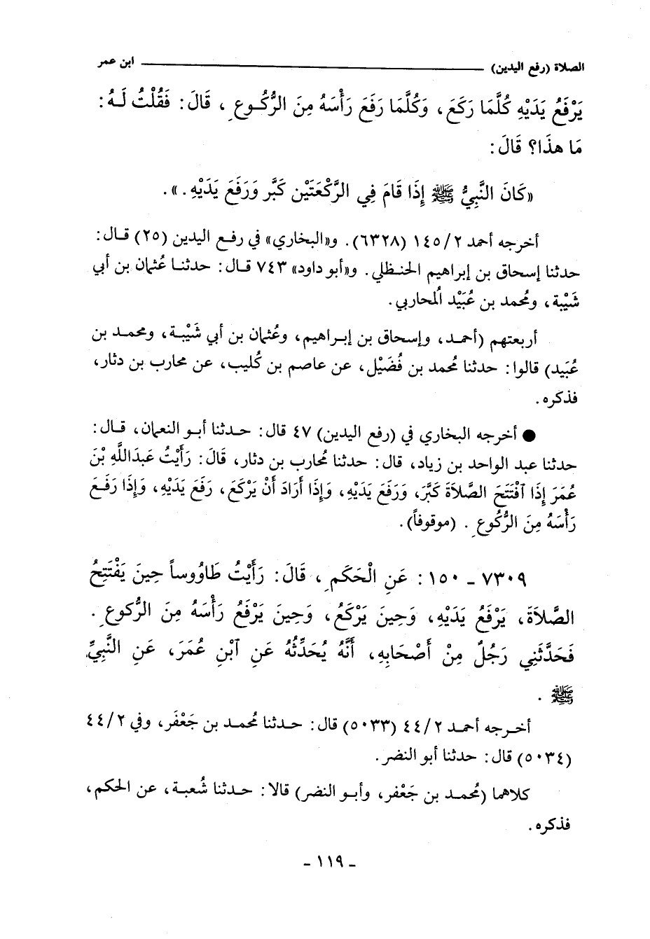 - وأخرجه البخاري في (رفع اليدين) ٤٧ قال: حدثنا أبو النعمان، حدثنا عبد الواحد بن زياد، حدثنا مُحارب بن دثار، قال: رَأيْتُ عبد الله بْنَ عُمرَ إذَا آفْتَتَحَ الصَّلَاةَ كَبَّرَ، وَرَفَعَ يَدَيْهِ، وَإِذَا أرَادَ أنْ يَرْكَعَ، رَفَعَ يَدَيْهِ، وَإِذَا رَفَعَ رَأَسَهُ مِنَ الرُّكُوعِ (موقوف.