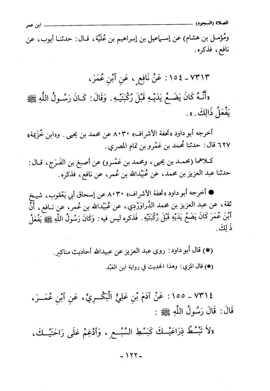 - أخرجه أبو داود , عن إسحاق أبي يَعْقوب، شيخ ثقة، عن عِبد العزيز بن مُحَمَّد الدَّراوَرْدِي، عن عبيد اللهّ بن عُمر، عن نافع، أنَّ ابن عُمَرَ كانَ يضعُ يَدَيْه قَبْلَ ركبتيه. ليس فيه: وَكَانَ رَسُولُ الله صلى الله عليه وسلم يَفْعَلُ ذلِكَ.