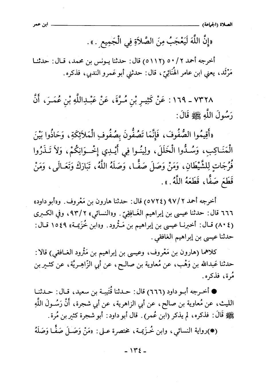 أَقِيمُوا الصُّفُوفَ فَإِنَّمَا تَصُفُّونَ بِصُفُوفِ الْمَلَائِكَةِ وَحَاذُوا بَيْنَ الْمَنَاكِبِ وَسُدُّوا الْخَلَلَ وَلِينُوا فِى أَيْدِى إِخْوَانِكُمْ وَلَا تَذَرُوا فُرُجَاتٍ لِلشَّيْطَانِ وَمَنْ وَصَلَ صَفًّا وَصَلَهُ اللَّهُ تَبَارَكَ وَتَعَالَى وَمَنْ قَطَعَ صَفًّا قَطَعَهُ اللَّهُ.