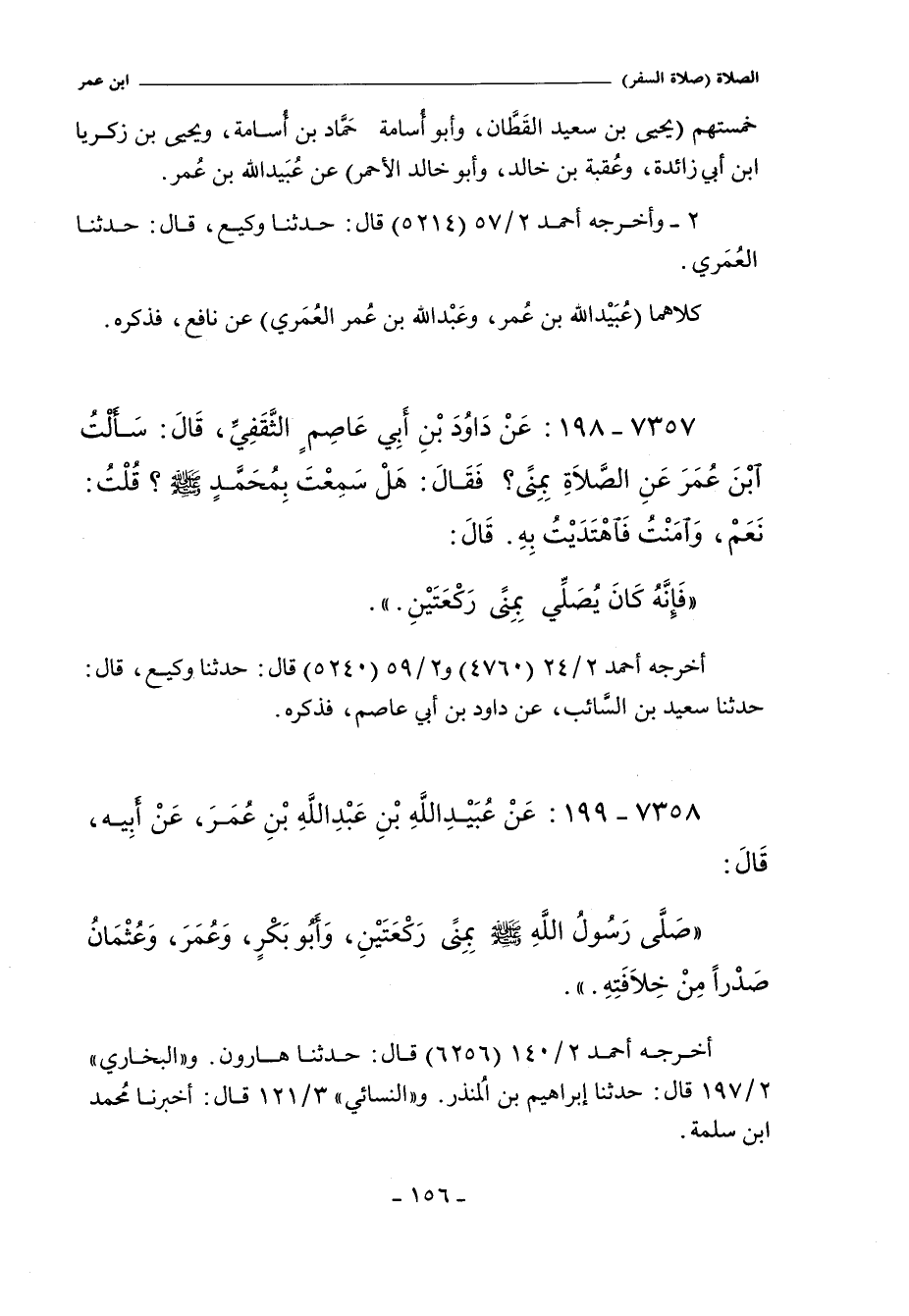 - أخرجه مالك "الموطأ" ٤٠٦ , عن نافع؛ أن عبد الله بن عمر كان يصلي وراء الإمام بمنى أربعا , فإذا صلى لنفسه , صلى ركعتين.