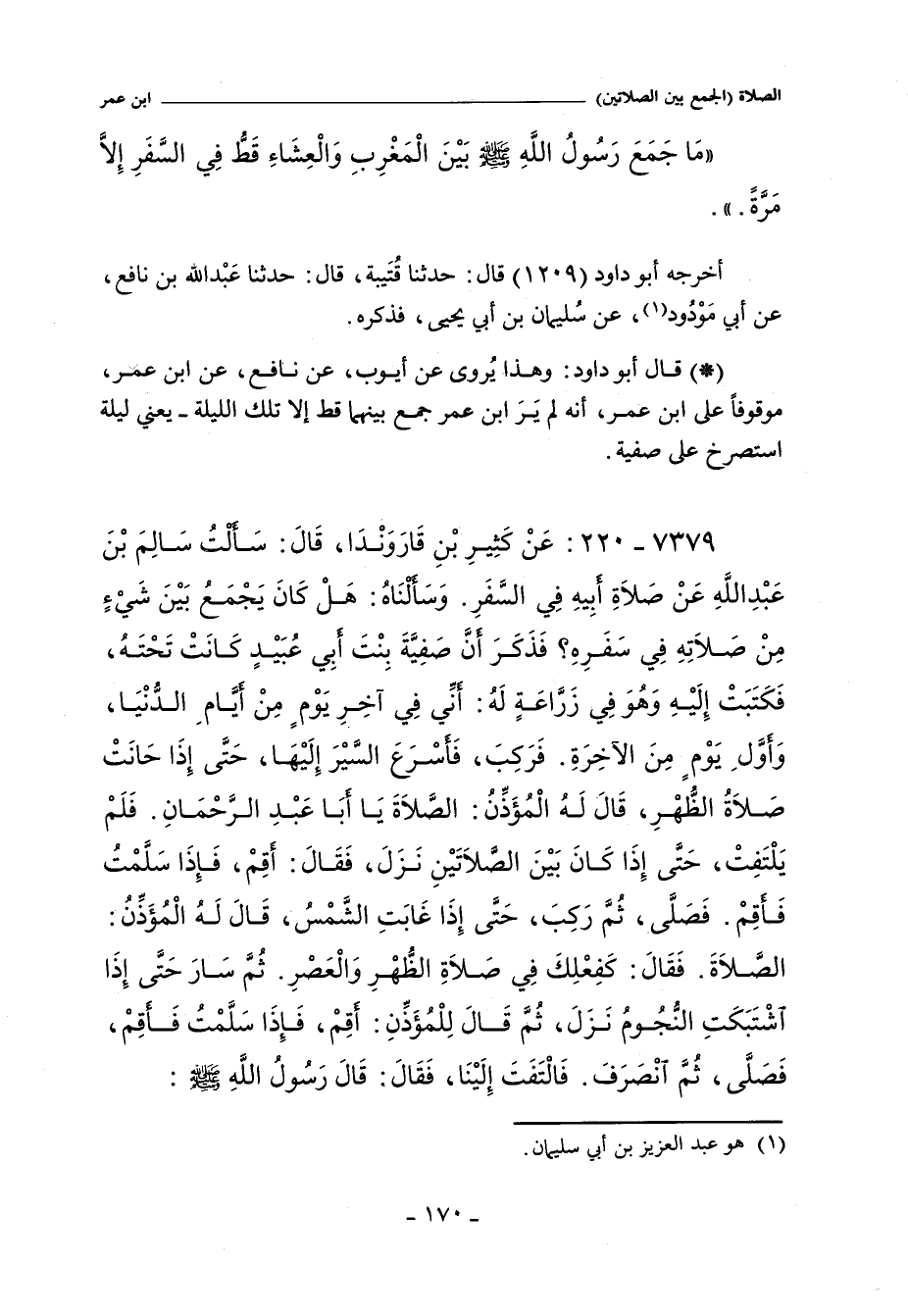 - قَالَ أَبُو دَاوُدَ: وَهَذَا يُرْوَى عَنْ أَيُّوبَ عَنْ نَافِعٍ عَنِ ابْنِ عُمَرَ مَوْقُوفًا عَلَى ابْنِ عُمَرَ أَنَّهُ لَمْ يُرَ ابْنُ عُمَرَ جَمَعَ بَيْنَهُمَا قَطُّ إِلَاّ تِلْكَ اللَّيْلَةَ يَعْنِى لَيْلَةَ اسْتُصْرِخَ عَلَى صَفِيَّةَ وَرُوِىَ مِنْ حَدِيثِ مَكْحُولٍ عَنْ نَافِعٍ أَنَّهُ رَأَى ابْنَ عُمَرَ فَعَلَ ذَلِكَ مَرَّةً أَوْ مَرَّتَيْنِ.