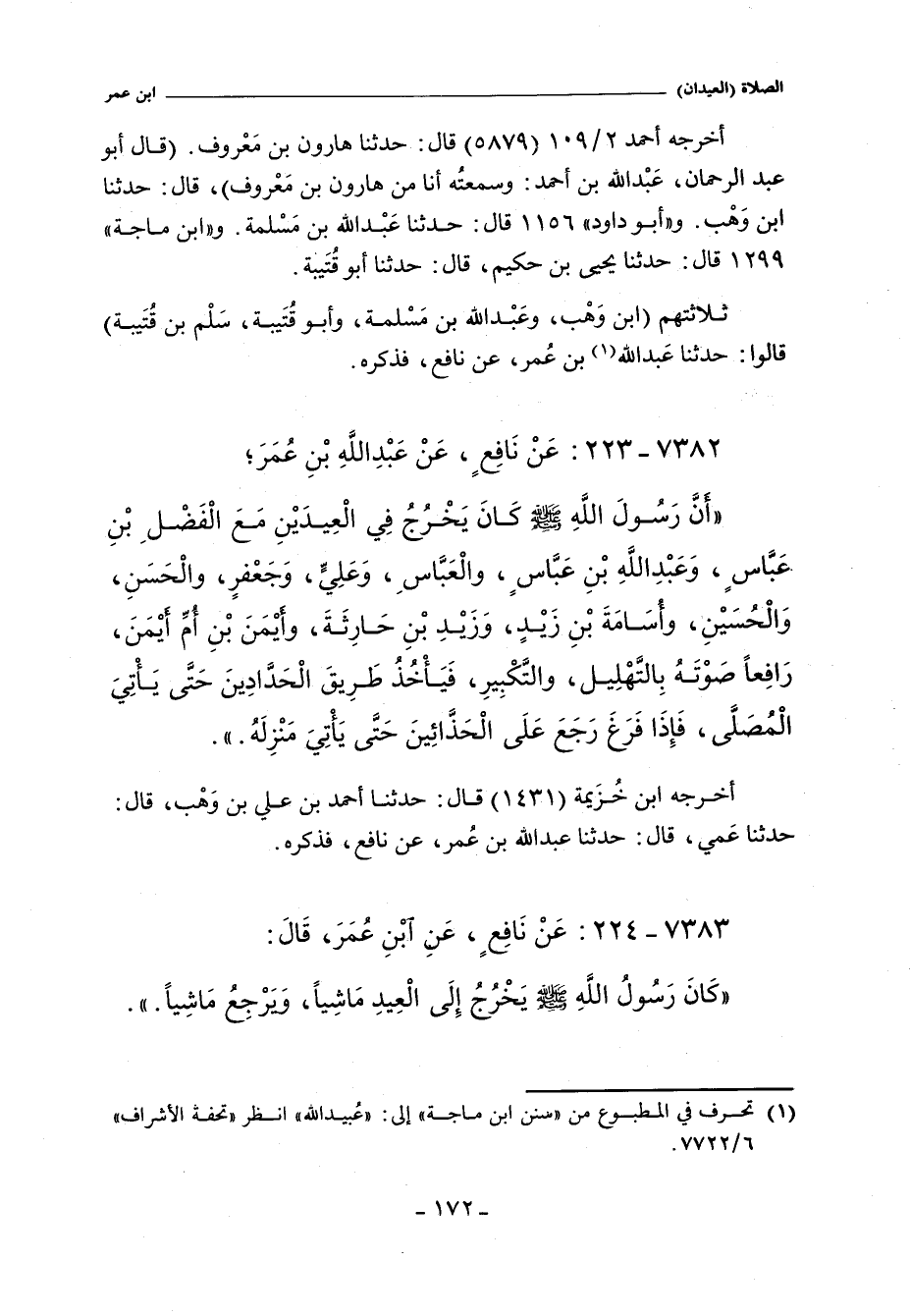 أنَّ رَسُولَ الله صلى الله عليه وسلم كَانَ يَخْرُجُ فِي الْعِيدَيْنِ مَعَ الْفَضْلِ بْنِ عَبَّاسٍ، وَعَبْدِ الله بْنِ عَبَّاسٍ، والْعَبَّاسِ، وَعَلِيٍّ، وَجَعْفرٍ، والْحَسَنِ، وَالْحُسَيْنِ، وأسَامَةَ بْنِ زَيْدٍ، وَزَيْدِ بْنِ حَارِثَةَ، وأَيْمَنَ بْنِ أمِّ أَيْمَنَ، رَافِعًا صَوْتَهُ بِالتَّهْلِيل، والتَّكْبِيرِ، فَيَأْخُذُ طَرِيقَ الْحَدَّادِينَ حَتَّى يَأْتِيَ الْمُصَلَّى، فَإِذَا فَرَغَ رَجَعَ عَلَى الْحَذَّائِينَ حَتَّى يَأْتِيَ مَنْزِلَهُ.