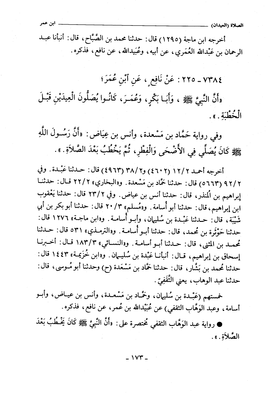 أخرجه ابن ماجة (١٢٩٥) قال: حدثنا مُحَمَّد بن الصَّبَاح، أنبأنا عبد الرحمن بن عبد الله العُمَري، عن أبيه، وعبيد الله، عن نافع، فذكره.