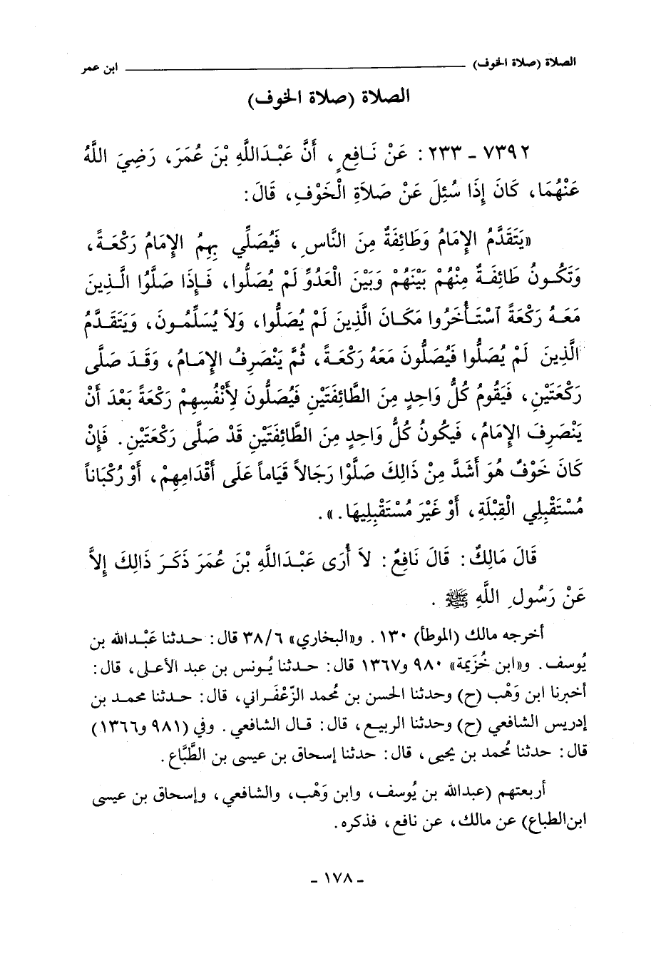 يَتَقَدَّمُ الإِمَامُ وَطَائِفَةٌ مِنَ النَّاسِ فَيُصَلِّى بِهِمِ الإِمَامُ رَكْعَةً، وَتَكُونُ طَائِفَةٌ مِنْهُمْ بَيْنَهُمْ وَبَيْنَ الْعَدُوِّ لَمْ يُصَلُّوا، فَإِذَا صَلَّوُا الَّذِينَ مَعَهُ رَكْعَةً اسْتَأْخَرُوا مَكَانَ الَّذِينَ لَمْ يُصَلُّوا وَلَا يُسَلِّمُونَ، وَيَتَقَدَّمُ الَّذِينَ لَمْ يُصَلُّوا فَيُصَلُّونَ مَعَهُ رَكْعَةً، ثُمَّ يَنْصَرِفُ الإِمَامُ وَقَدْ صَلَّى رَكْعَتَيْنِ، فَيَقُومُ كُلُّ وَاحِدٍ مِنَ الطَّائِفَتَيْنِ فَيُصَلُّونَ لأَنْفُسِهِمِ رَكْعَةً بَعْدَ أَنْ يَنْصَرِفَ الإِمَامُ، فَيَكُونُ كُلُّ وَاحِدٍ مِنَ الطَّائِفَتَيْنِ قَدْ صَلَّى رَكْعَتَيْنِ، فَإِنْ كَانَ خَوْفٌ هُوَ أَشَدَّ مِنْ ذَلِكَ صَلَّوْا رِجَالاً، قِيَامًا عَلَى أَقْدَامِهِمْ، أَوْ رُكْبَانًا مُسْتَقْبِلِى الْقِبْلَةِ أَوْ غَيْرَ مُسْتَقْبِلِيهَا. قَالَ مَالِكٌ قَالَ نَافِعٌ لَا أُرَى عَبْدَ اللَّهِ بْنَ عُمَرَ ذَكَرَ ذَلِكَ إِلَاّ عَنْ رَسُولِ اللَّهِ صلى الله عليه وسلم.