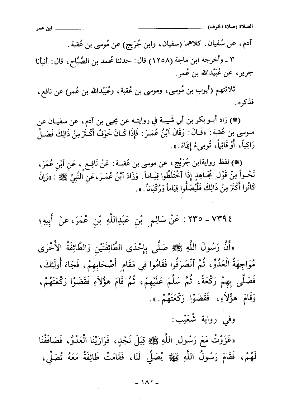 - أخرجه البخاري ٢/ ١٨ (٩٤٣) قال: حَدَّثَنَا سَعِيدُ بْنُ يَحْيَى بْنِ سَعِيدٍ الْقُرَشِىُّ , قَالَ: حَدَّثَنِى أَبِى. قَالَ: حَدَّثَنَا ابْنُ جُرَيْجٍ , عَنْ مُوسَى بْنِ عُقْبَةَ , عَنْ نَافِعٍ , عَنِ ابْنِ عُمَرَ , نَحْوًا مِنْ قَوْلِ مُجَاهِدٍ؛ (إِذَا اخْتَلَطُوا قِيَامًا) , وَزَادَ ابْنُ عُمَرَ , عَنِ النَّبِىِّ صلى الله عليه وسلم؛ (وَإِنْ كَانُوا أَكْثَرَ مِنْ ذَلِكَ , فَلْيُصَلُّوا قِيَامًا وَرُكْبَانًا.