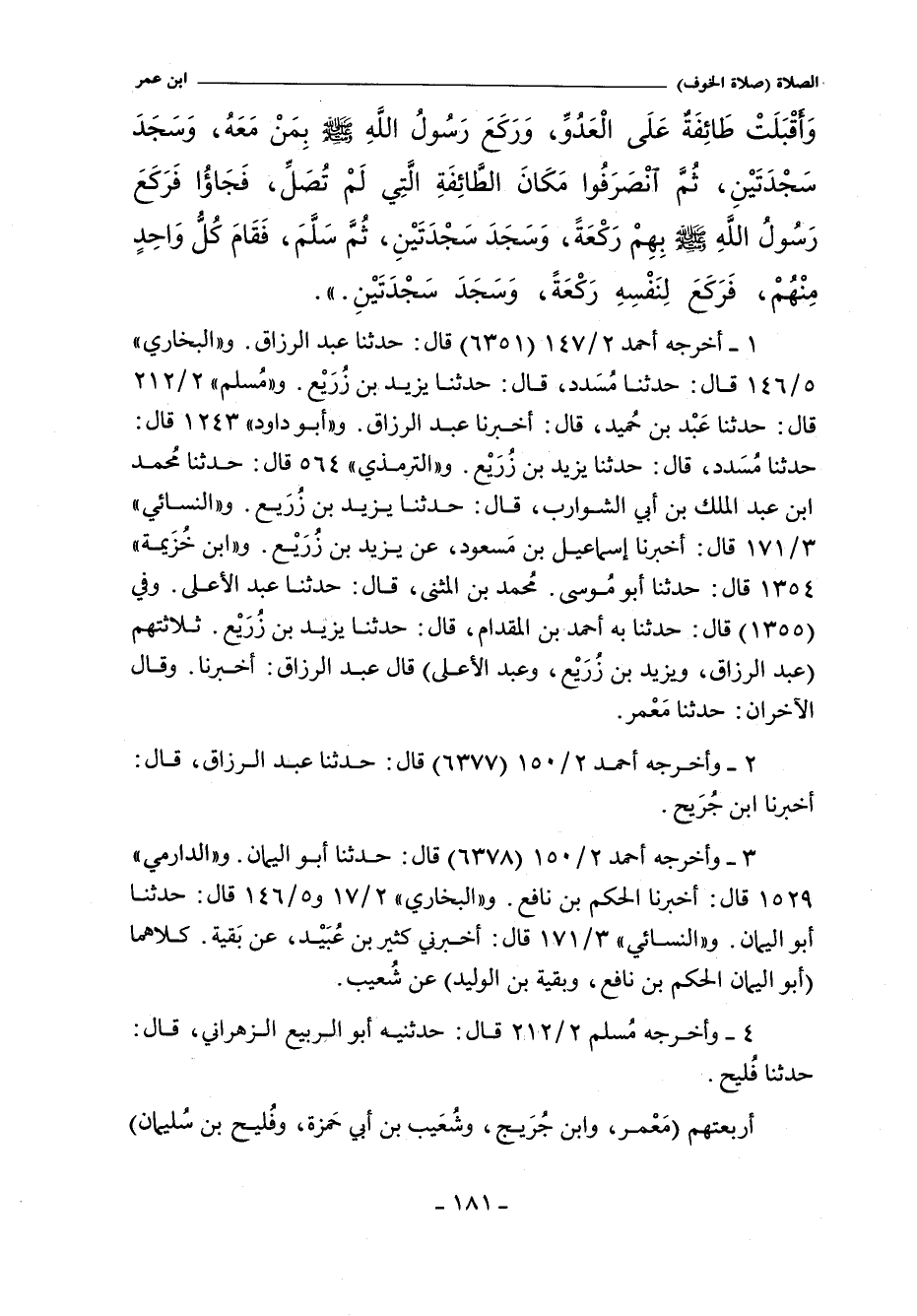 وَأَقْبَلَتْ طَائِفَةٌ عَلَى الْعَدُوِّ وَرَكَعَ رَسُولُ اللَّهِ صلى الله عليه وسلم بِمَنْ مَعَهُ، وَسَجَدَ سَجْدَتَيْنِ، ثُمَّ انْصَرَفُوا مَكَانَ الطَّائِفَةِ الَّتِى لَمْ تُصَلِّ، فَجَاءُوا، فَرَكَعَ رَسُولُ اللَّهِ صلى الله عليه وسلم بِهِمْ رَكْعَةً، وَسَجَدَ سَجْدَتَيْنِ ثُمَّ سَلَّمَ، فَقَامَ كُلُّ وَاحِدٍ مِنْهُمْ فَرَكَعَ لِنَفْسِهِ رَكْعَةً وَسَجَدَ سَجْدَتَيْنِ.