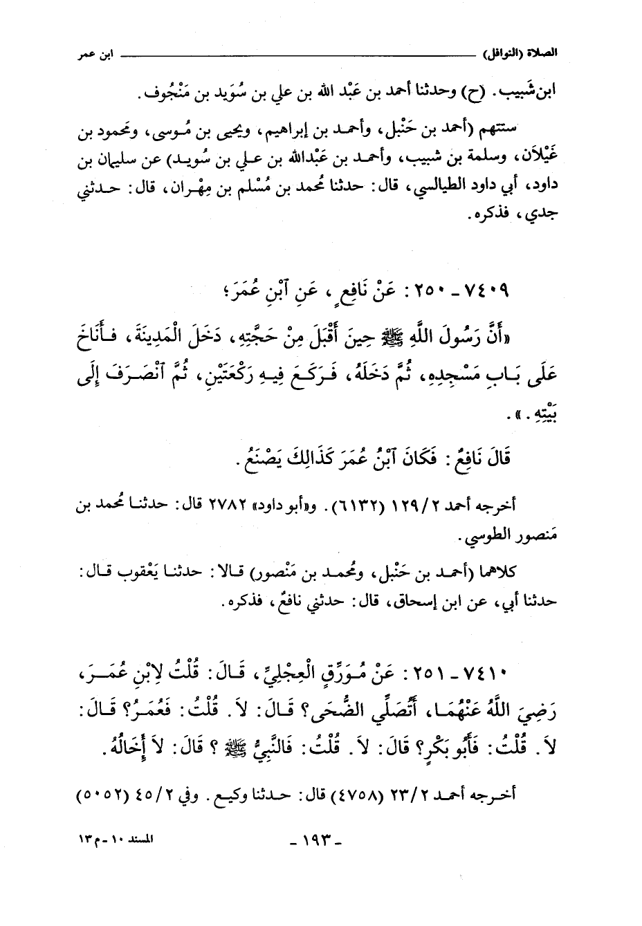 ٧٤١٠ - عَنْ مُوَرِّقٍ قَالَ قُلْتُ لاِبْنِ عُمَرَ - رضى الله عنهما - أَتُصَلِّى الضُّحَى قَالَ لَا. قُلْتُ فَعُمَرُ. قَالَ لَا. قُلْتُ فَأَبُو بَكْرٍ. قَالَ لَا. قُلْتُ فَالنَّبِىُّ صلى الله عليه وسلم قَالَ لَا إِخَالُهُ.