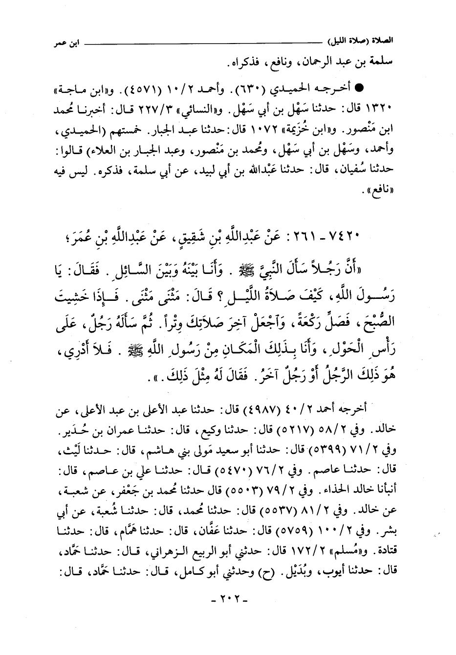 خمستهم (الحميدي، وأحمد بن حنبل، وسهل، ومُحَمَّد بن منصور، وعبد الجبار بن العلاء) قالوا: حَدَّثَنَا سُفْيان. قَالَ حدثنا عبد الله بْنِ أَبِى لَبِيدٍ , عَنْ أَبِى سَلَمَةَ , عَنِ ابْنِ عُمَرَ؛
