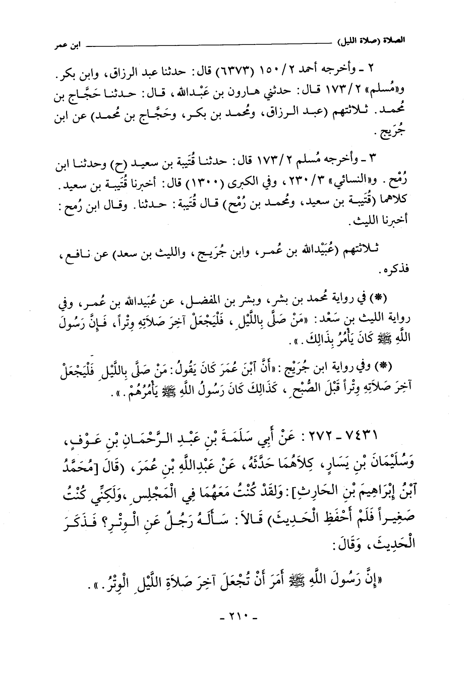 وفي ٢/ ١٥٠ (٦٣٧٣) قال: حدثنا عبد الرزاق، وابن بكر. قالا: أخبرنا ابن جريج. و"البُخَارِي". وفي ٢/ ٣١ (٩٩٨) قال: حدثنا مُسَدد، قال: حدثنا يحيى بن سعيد، عن عبيد الله. و"مسلم" ٢/ ١٧٣ (١٧٠٢) قال: حدثنا قُتَيبة بن سعيد، حدثنا ليث (ح) وحدثنا ابن رُمْح، أخبرنا الليث. وفي (١٧٠٣) قال: وحدثنا أبو بكر بن أبي شَيْبَة، حدثنا أبو أسامة (ح) وحدثنا ابن نُمَيْر، حدثنا أبي (ح) وحدثني زُهَيْر بن حَرْب، وابن المثنى. قالا: حدثنا يحيى، كلهم عن عبيد الله. وفي (١٧٠٤) قال: وحدثني هارون بن عبد الله، حدثنا حَجَّاج بن مُحَمَّد. قال: قال ابن جريج. و"أبو داود" ١٤٣٨ قال: حدثنا أحمد بن حَنْبل، حدثنا يحيى، عن عبيد الله. و"النَّسائي" ٣/ ٢٣٠، وفي "الكبرى" ١٣٩٥ قال: أخبرنا قتَيبة. قال: حدَّثنا الليث. و"ابن خزيمة" ١٠٨٢ قال: حدثنا بُنْدار، حدثنا يحيى، حدثنا عبيد الله (ح) وحدثنا الدورقىِ، والحسن الزعفراني بن مُحَمَّد. قالا: حدثنا مُحَمَّد بن عُبَيْد، حدثنا عبيد الله (ح) وحدثنا يحيى بن حكيم، قال: حدثنا حَمَاد بن مَسْعدة، عن عبيد الله.