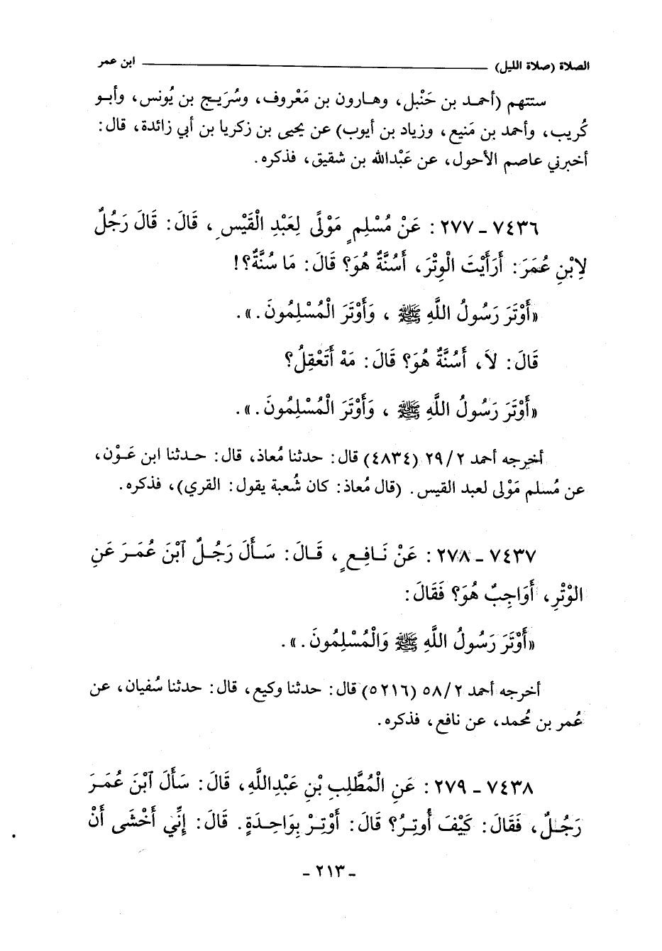 - أخرجه مالك "الموطأ" ٣٢٣، أَنَّهُ بَلَغَهُ , أَنَّ رَجُلاً سَأَلَ عَبْدَ اللَّهِ بْنَ عُمَرَ عَنِ الْوِتْرِ , أَوَاجِبٌ هُوَ؟ فَقَالَ عَبْدُ اللَّهِ بْنُ عُمَرَ: قَدْ أَوْتَرَ رَسُولُ اللَّهِ صلى الله عليه وسلم , وَأَوْتَرَ الْمُسْلِمونَ , فَجَعَلَ الرَّجُلُ يُرَدِّدُ عَلَيْهِ , وَعَبْدُ اللَّهِ بْنُ عُمَرَ يَقُولُ: أَوْتَرَ رَسُولُ اللَّهِ صلى الله عليه وسلم , وَأَوْتَرَ الْمُسْلِمونَ.