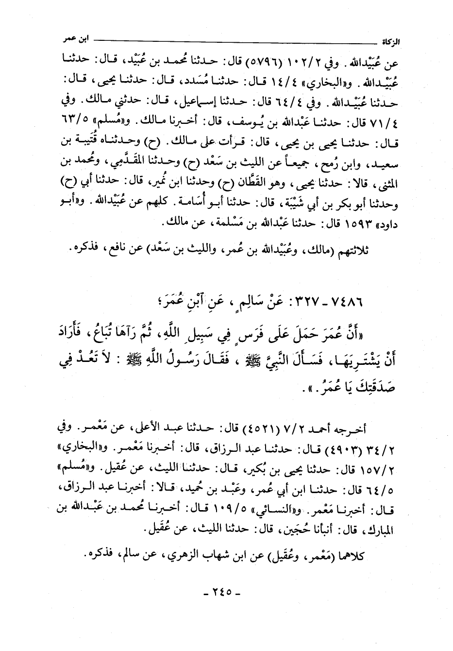 أَنَّ عُمَرَ حَمَلَ عَلَى فَرَسٍ فِى سَبِيلِ اللَّهِ ثُمَّ رَآهَا تُبَاعُ فَأَرَادَ أَنْ يَشْتَرِيَهَا فَسَأَلَ النَّبِىَّ صلى الله عليه وسلم فَقَالَ رَسُولُ اللَّهِ صلى الله عليه وسلم لَا تَعُدْ فِى صَدَقَتِكَ يَا عُمَرُ.