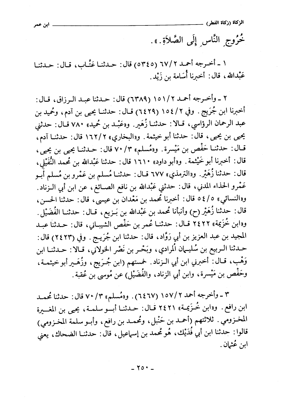 أخرجه أحمد ٢/ ٦٧ (٥٣٤٥) قال: حدَّثنا عتاب , حدثنا عبد الله , أخبرنا أسامة بن زيد. وفي ٢/ ١٥١ (٦٣٨٩) قال: حدَّثنا عبد الرزاق , أخبرنا ابن جريج. أخبرني موسى بن عقبة. وفي ٢/ ١٥٤ (٦٤٢٩) قال: حدَّثنا يحيى بن آدم , وحميد بن عبد الرحمن الرؤاسي. قالا: حدثنا زهير , حدثنا موسى بن عقبة. وفي ٢/ ١٥٧ (٦٤٦٧) قال: حدَّثنا مُحَمَّد بن إسماعيل بن أبي فديك , حدثنا الضحاك , يعني بن عثمان. و (عبد بن حميد) ٧٨٠ قال: حدَّثني يحيى بن يحيى , حدثنا أبو خيثمة , عن موسى بن عقبة. و"البُخَاريّ" ٢/ ١٦٢ (١٥٠٩) قال: حدَّثنا آدم , حدثنا حفص بن ميسرة , حدثنا موسى بن عقبة. و"مسلم" ٣/ ٧٠ (٢٢٥٠) قال: حدَّثنا يحيى بن يحيى , أخبرنا أبو خيثمة , عن موسى بن عقبة. وفي (٢٢٥١) قال: حدَّثنا مُحَمَّد بن رافع , حدثنا ابن أبي فديك , أخبرنا الضحاك. و"أبو داود" ١٦١٠ قال: حدَّثنا عبد الله بن مُحَمَّد النفيلي , حدثنا زهير , حدثنا موسى بن عقبة. والتِّرْمِذِيّ" ٦٧٧ قال: حدَّثنا مُسْلِم بن عمرو بن مُسْلِم , أبو عمرو الحذاء المدني , حدثني عبد الله بن نافع الصائغ , عن ابن أبي الزناد , عن موسى بن عقبة. و"النَّسَائي" ٥/ ٥٤ , وفي "الكبرى" ٢٣١٢ قال: أخبرنا مُحَمَّد بن معدان بن عيسى. قال: حدَّثنا الحسن , حدثنا زهير , حدثنا موسى (ح) قال: وأنبأنا مُحَمَّد بن عبد الله بن بزيع. قال: حدَّثنا الفضيل. حدثنا موسى. و"ابن خزيمة" ٢٤٢١ قال: حدَّثنا أبو سلمة يحيى بن المغيرة المخزومي , حدثنا ابن أبي فديك , عن الضحاك بن عثمان. وفي (٢٤٢٢) قال: حدَّثنا عمر بن حفص الشيباني , حدثنا عبد المجيد بن عبد العزيز بن أبي رواد , حدثنا ابن جريج , عن موسى بن عقبة.
