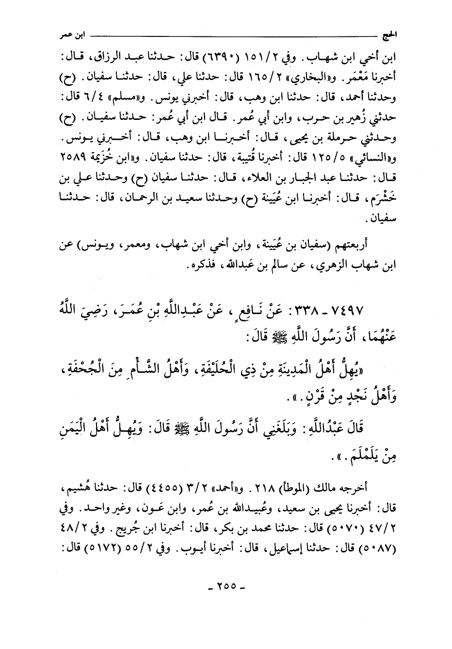 ابن أخي ابن شهاب. وفي ٢/ ١٥١ (٦٣٩٠) قال: حدثنا عبد الرزاق، أخبرنا مَعْمَر. و"البُخَارِي" ٢/ ١٦٥ (١٥٢٧) قال: حدثنا علي، حدثنا سُفْيان. وفي (١٥٢٨) قال: حدَّثنا أحمد، حدثنا ابن وهب. قال: أخبرني يونس. و"مسلم" ٤/ ٦ (٢٧٧٦) قال: حدثني زُهير بن حرب، وابن أبي عُمر. قال ابن أبي عُمر: حدثنا سُفْيان. وفي (٢٧٧٧) قال: وحدثني حرملة بن يحيى، أخبرنا ابن وهب، أخبرني يونس. و"النَّسائي" ٥/ ١٢٥، وفي "الكبرى" ٣٦٢١ قال: أخبرنا قُتيبة. قال: حدثنا سُفْيان. و"ابن خزيمة" ٢٥٨٩ قال: حدثنا عبد الجبار بن العلاء، حدثنا سُفْيان (ح) وحدثنا علي بن خَشْرَم، أخبرنا ابن عُيَينة (ح) وحدثنا سعيد بن الرحمن، حدثنا سُفْيان.
