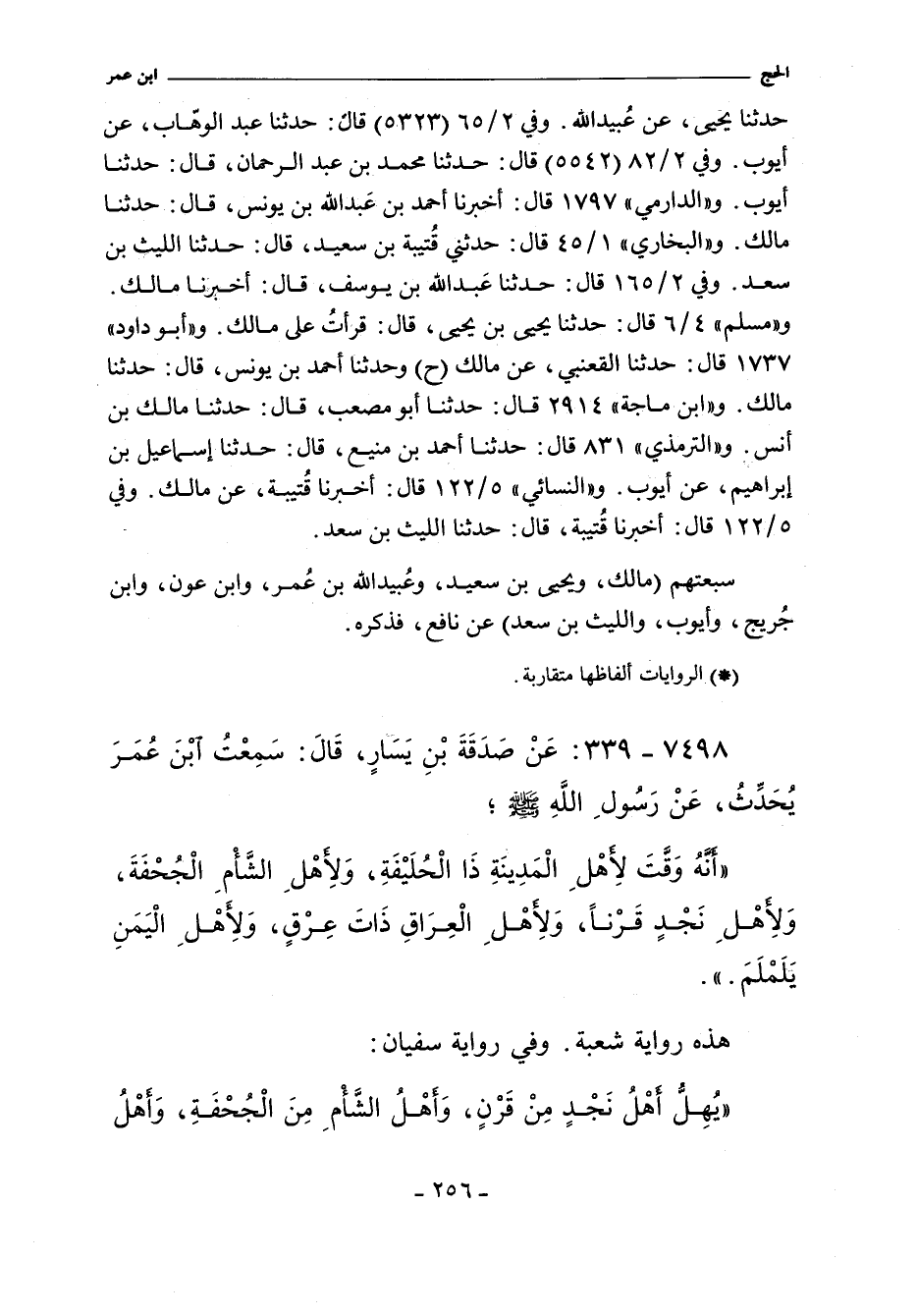 حدثنا يحيى، عن عُبيد الله. وفي ٢/ ٦٥ (٥٣٢٣) قال: حدثنا عبد الوهاب، عن أيوب. وفي ٢/ ٨٢ (٥٥٤٢) قال: حدثنا مُحَمَّد بن عبد الرحمن، حدثنا أيوب. و"الدارمي" ١٧٩٠ قال: أخبرنا أحمد بن عبد الله بن يونس، حدثنا مالك. و"البُخَارِي" ١/ ٤٥ (١٣٣) قال: حدثني قُتيبة بن سعيد. قال: حدثنا الليث بن سعد. وفي ٢/ ١٦٥ (١٥٢٥) قال: حدثنا عبد الله بن يوسف، أخبرنا مالك. و"مسلم" ٤/ ٦ (٢٧٧٥) قال: حدثنا يحيى بن يحيى، قال: قرأتُ على مالك. و"أبو داود" ١٧٣٧ قال: حدثنا القعنبي، عن مالك (ح) وحدثنا أحمد بن يونس، حدثنا مالك. و (اابن ماجة) ٢٩١٤ قال: حدثنا أبو مصعب، حدثنا مالك بن أنس. والتِّرْمِذِيّ" ٨٣١ قال: حدثنا أحمد بن منيع، حدثنا إسماعيل بن إبراهيم، عن أيوب. و"النَّسائي" ٥/ ١٢٢، وفي "الكبرى" ٣٦١٧ قال: أخبرنا قُتيبة، عن مالك. وفي ٥/ ١٢٢، وفي "الكبرى" ٣٦١٨ و ٥٨٧٢ قال: أخبرنا قُتيبة. قال: حدثنا الليث بن سعد.
