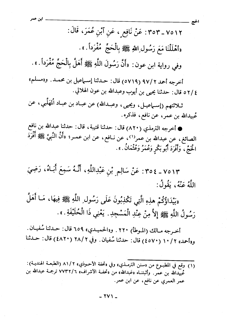 - لفظ ابْنُ عَوْنٍ: أَنَّ رَسُولَ اللَّهِ صلى الله عليه وسلم أَهَلَّ بِالْحَجِّ مُفْرَدًا.