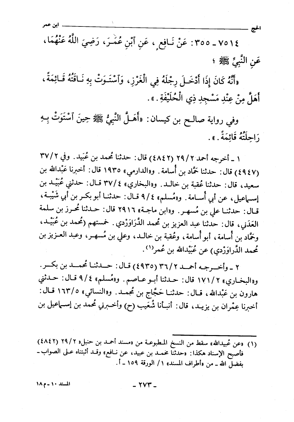 - وفي رواية: كَانَ رَسُولُ اللَّهِ صلى الله عليه وسلم إِذَا وَضَعَ رِجْلَهُ فِى الْغَرْزِ وَانْبَعَثَتْ بِهِ رَاحِلَتُهُ قَائِمَةً أَهَلَّ مِنْ ذِى الْحُلَيْفَةِ.
