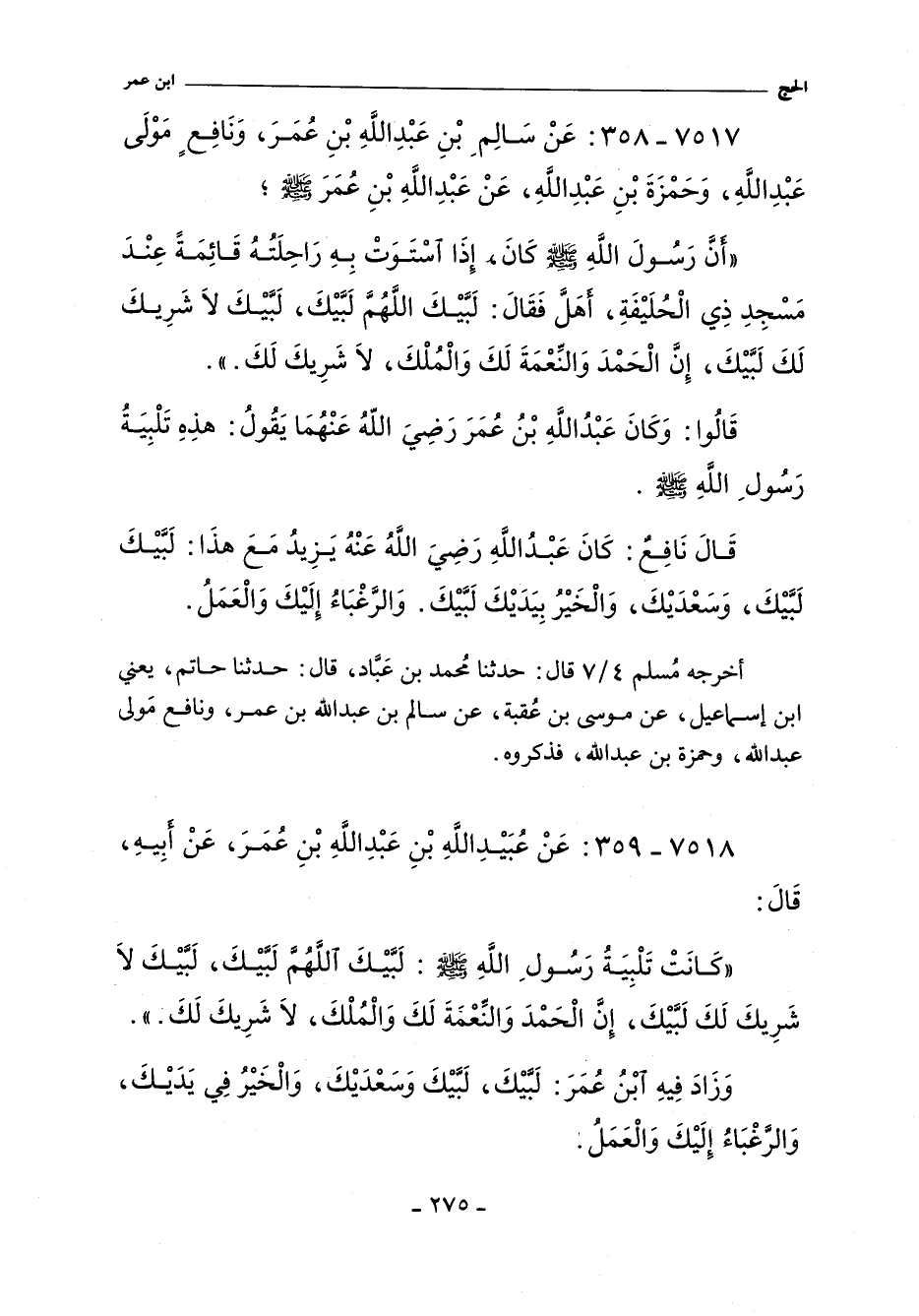 قَالَ نَافِعٌ كَانَ عَبْدُ اللَّهِ - رضى الله عنه - يَزِيدُ مَعَ هَذَا لَبَّيْكَ لَبَّيْكَ وَسَعْدَيْكَ وَالْخَيْرُ بِيَدَيْكَ لَبَّيْكَ وَالرَّغْبَاءُ إِلَيْكَ وَالْعَمَلُ.