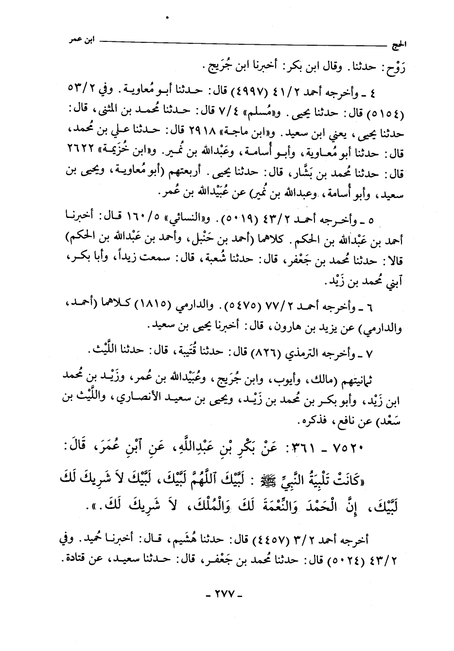 وفي ٢/ ٤١ (٤٩٩٧) قال: حدَّثنا أبو معاوية، حدثنا عبيد الله. وفي ٢/ ٤٣ (٥٠١٩) قال: حدَّثنا مُحَمَّد بن جعفر، حدثنا شعبة، عن زيد، وأبي بكر ابني مُحَمَّد. وفي ٢/ ٤٧ (٥٠٧١) قال عبد الله بن أحمد: وجدت في كتاب أبي: حدثنا مُحَمَّد بن بكر، أخبرنا ابن جريج. وفي ٢/ ٤٨ (٥٠٨٦) قال: حدَّثنا إسماعيل بن إبراهيم، أخبرنا أيوب. وفي ٢/ ٥٣ (٥١٥٤) قال: حدَّثنا يحيى، عن عبيد الله. وفي ٢/ ٧٧ (٥٤٧٤) قال: حدَّثنا يزيد، أخبرنا يحيى بن سعيد. و"الدارمي" ١٨٠٨ قال: أخبرنا يزيد بن هارون، أخبرنا يحيى، يعني ابن سعيد. و"البُخَارِي" ٢/ ١٧٠ (١٥٤٩) قال: حدثنا عبد الله بن يُوسف، أخبرنا مالك. و"مسلم" ٤/ ٧ (٢٧٨١) قال: حدثنا يحيى بن يحيى التميمي. قال: قرأت على مالك. وفي (٢٧٨٣) قال: وحدثنا مُحَمَّد بن المثنى، حدثنا يحيى، يعني ابن سعيد، عن عبيد الله. و"أبو داود" ١٨١٢ قال: حدثنا القَعْنَبِيّ، عن مالك. و"ابن ماجة" ٢٩١٨ قال: حدَّثنا علي بن مُحَمَّد، حدثنا أبو معاوية، وأبو أسامة، وعبد الله بن نُمَيْر، عن عبيد الله بن عمر. والتِّرْمِذِيّ" ٨٢٥ قال: حدَّثنا أحمد بن منيع، حدثنا إسماعيل بن إبراهيم، عن أيوب. وفي (٨٢٦) قال: حدَّثنا قتيبة، حدثنا الليث. و (النسائىِ) ٥/ ١٦٠، وفي "الكبرى" ٣٧١٤ قال: أخبرنا أحمد بن عبد الله بن الحكم. قال: حدَّثنا مُحَمَّد بن جعفر. قال: حدَّثنا شعبة. قال: سَمِعْتُ زيدا، وأبا بكر ابني مُحَمَّد بن زيد. وفي ٥/ ١٦٠، وفي "الكبرى" ٣٧١٥ قال: أخبرنا قتيبة بن سعيد، عن مالك. و"ابن خزيمة" ٢٦٢١ قال: حدثنا أحمد بن منَيع، ومُؤَمَّل بن هشام، قالا: حدثنا إسماعيل. قال