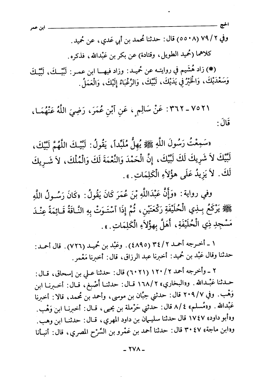 وَكَانَ عَبْدُ اللَّهِ بْنُ عُمَرَ رضى الله عنهما يَقُولُ كَانَ عُمَرُ بْنُ الْخَطَّابِ رضى الله عنه يُهِلُّ بِإِهْلَالِ رَسُولِ اللَّهِ صلى الله عليه وسلم مِنْ هَؤُلَاءِ الْكَلِمَاتِ وَيَقُولُ لَبَّيْكَ اللَّهُمَّ لَبَّيْكَ لَبَّيْكَ وَسَعْدَيْكَ وَالْخَيْرُ فِى يَدَيْكَ لَبَّيْكَ وَالرَّغْبَاءُ إِلَيْكَ وَالْعَمَلُ.