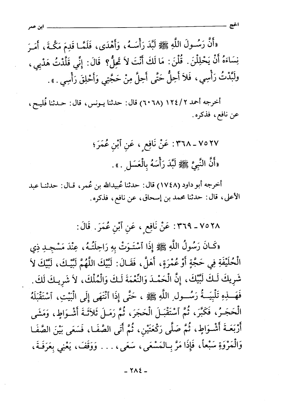 - وفي (٢٧٦٣): كَانَ رَسُولَ اللَّهِ , صلى الله عليه وسلم , إِذَا اسْتَوَتْ بِهِ رَاحِلَتُهُ , عِنْدَ مَسْجِدِ ذِى الْحُلَيْفَةِ فِي حَجَّةٍ , أَوْ عُمْرَةٍ , أَهَلَّ. فذكر الحديث. وقال: ثم أتى الصفا , فسعى بين الصفا والمروة سبعا , فإذا مر بالمسعى سعى.