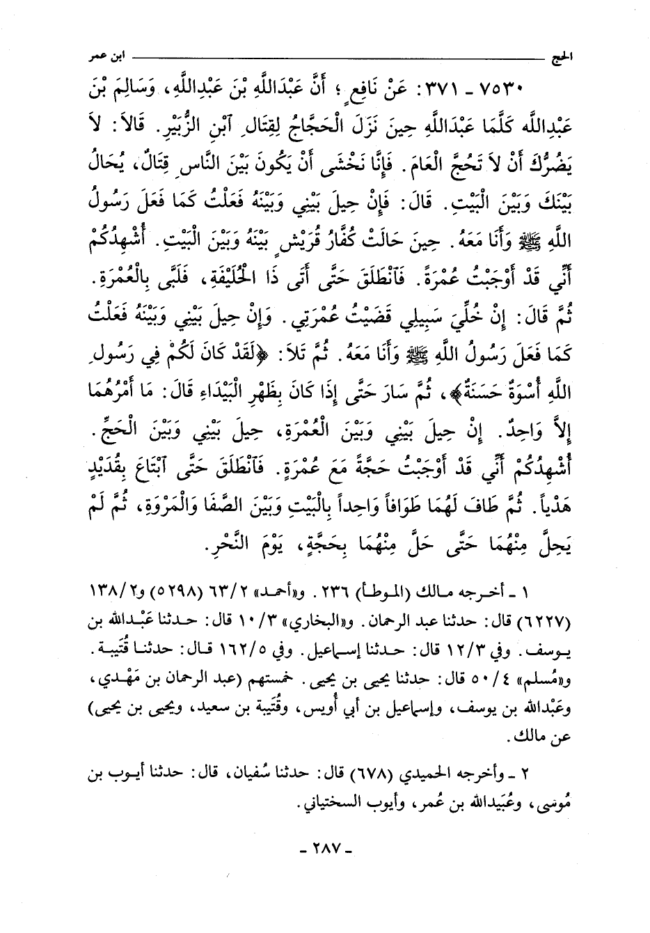٧٥٣٠ - عَنْ نَافِعٌ أَنَّ عَبْدَ اللَّهِ بْنَ عَبْدِ اللَّهِ وَسَالِمَ بْنَ عَبْدِ اللَّهِ كَلَّمَا عَبْدَ اللَّهِ حِينَ نَزَلَ الْحَجَّاجُ لِقِتَالِ ابْنِ الزُّبَيْرِ قَالَا لَا يَضُرُّكَ أَنْ لَا تَحُجَّ الْعَامَ فَإِنَّا نَخْشَى أَنْ يَكُونَ بَيْنَ النَّاسِ قِتَالٌ يُحَالُ بَيْنَكَ وَبَيْنَ الْبَيْتِ قَالَ فَإِنْ حِيلَ بَيْنِى وَبَيْنَهُ فَعَلْتُ كَمَا فَعَلَ رَسُولُ اللَّهِ صلى الله عليه وسلم وَأَنَا مَعَهُ حِينَ حَالَتْ كُفَّارُ قُرَيْشٍ بَيْنَهُ وَبَيْنَ الْبَيْتِ أُشْهِدُكُمْ أَنِّى قَدْ أَوْجَبْتُ عُمْرَةً. فَانْطَلَقَ حَتَّى أَتَى ذَا الْحُلَيْفَةِ فَلَبَّى بِالْعُمْرَةِ ثُمَّ قَالَ إِنْ خُلِّىَ سَبِيلِى قَضَيْتُ عُمْرَتِى وَإِنْ حِيلَ بَيْنِى وَبَيْنَهُ فَعَلْتُ كَمَا فَعَلَ رَسُولُ اللَّهِ صلى الله عليه وسلم وَأَنَا مَعَهُ. ثُمَّ تَلَا (لَقَدْ كَانَ لَكُمْ فِى رَسُولِ اللَّهِ أُسْوَةٌ حَسَنَةٌ) ثُمَّ سَارَ حَتَّى إِذَا كَانَ بِظَهْرِ الْبَيْدَاءِ قَالَ مَا أَمْرُهُمَا إِلَاّ وَاحِدٌ إِنْ حِيلَ بَيْنِى وَبَيْنَ الْعُمْرَةِ حِيلَ بَيْنِى وَبَيْنَ الْحَجِّ أُشْهِدُكُمْ أَنِّى قَدْ أَوْجَبْتُ حَجَّةً مَعَ عُمْرَةٍ. فَانْطَلَقَ حَتَّى ابْتَاعَ بِقُدَيْدٍ هَدْيًا ثُمَّ طَافَ لَهُمَا طَوَافًا وَاحِدًا بِالْبَيْتِ وَبَيْنَ الصَّفَا وَالْمَرْوَةِ ثُمَّ لَمْ يَحِلَّ مِنْهُمَا حَتَّى حَلَّ مِنْهُمَا بِحَجَّةٍ يَوْمَ النَّحْرِ.