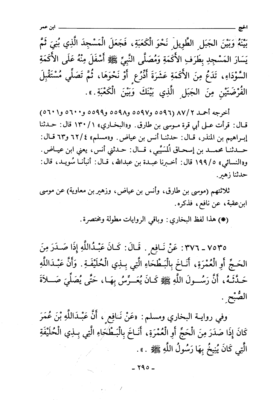 وفي رواية البخاري ومسلم: عَنْ نَافِعٍ , أَنَّ عَبْدَ اللَّهِ بْنَ عُمَرَ كَانَ إِذَا صَدَرَ مِنَ الْحَجِّ أَوِ الْعُمْرَةِ , أَنَاخَ بِالْبَطْحَاءِ الَّتِى بِذِى الْحُلَيْفَةِ الَّتِى كَانَ يُنِيخُ بِهَا رَسُولُ اللَّهِ صلى الله عليه وسلم.