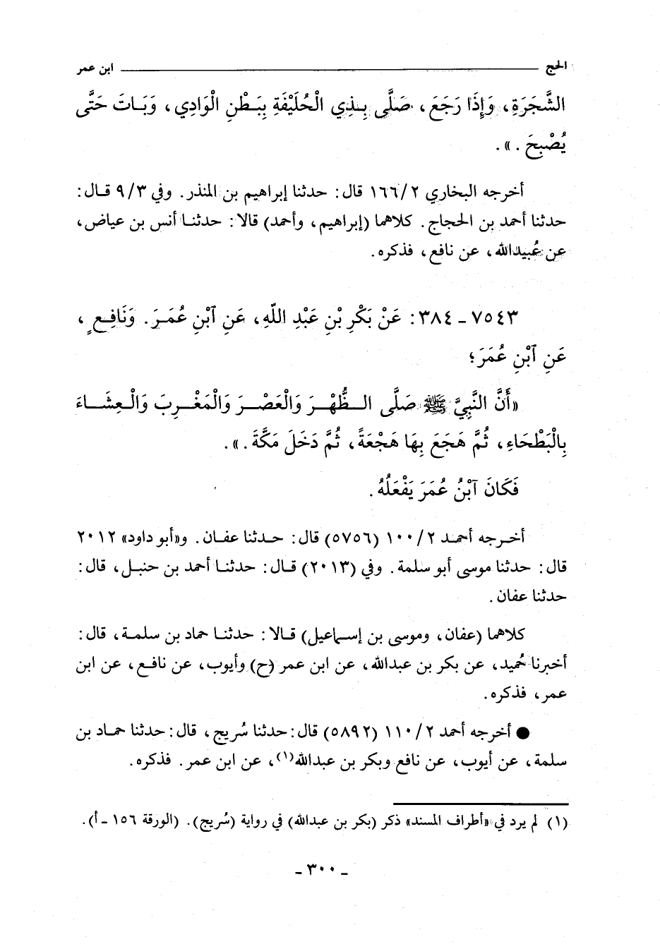 ٧٥٤٣ - عَنْ بَكْرِبْنِ عَبْدِ الله، عَنِ ابْنِ عُمَرَ. وَنَافِعٍ، عَنِ ابْنِ عُمَرَء أَنَّ النَّبِيَّ لمجو صَلَّى الظُّهْرَ وَالْعَصْرَ وَالْمَغْرِبَ وَالْعِشَاءَ بِالْبَطْحَاءِ، ثُمَّ هَجَعَ بِهَا هَجْعَةً، ثُمَّ دَخَلَ مَكَّةَ. فَكَانَ ابْنُ عُمَرَ يَفْعَلُهُ.