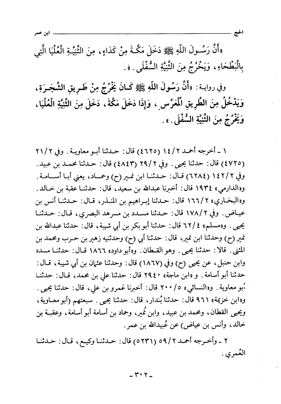 - وفي رواية: أَنَّ رَسُولَ اللَّهِ صلى الله عليه وسلم كَانَ يَخْرُجُ مِنْ طَرِيقِ الشَّجَرَةِ وَيَدْخُلُ مِنْ طَرِيقِ الْمُعَرَّسِ وَإِذَا دَخَلَ مَكَّةَ دَخَلَ مِنَ الثَّنِيَّةِ الْعُلْيَا وَيَخْرُجُ مِنَ الثَّنِيَّةِ السُّفْلَى.
