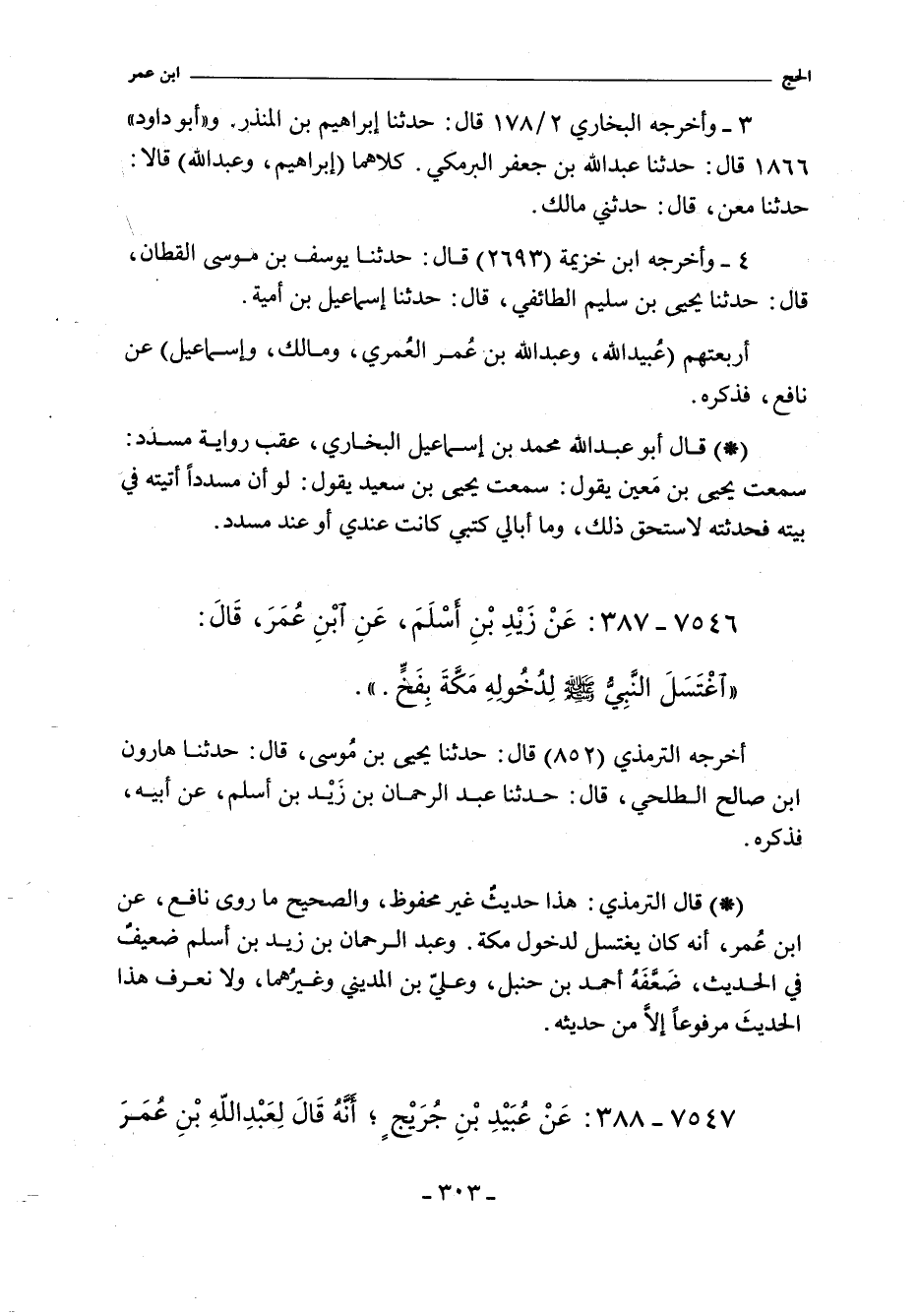 - قَالَ الترمذي: هَذَا حَدِيثٌ غَيْرُ مَحْفُوظٍ , وَالصَّحِيحُ مَا رَوَى نَافِعٌ , عَنِ ابْنِ عُمَرَ , أَنَّهُ كَانَ يَغْتَسِلُ لِدُخُولِ مَكَّةَ. وَعَبْدُ الرَّحْمَنِ بْنُ زَيْدِ بْنِ أَسْلَمَ ضَعِيفٌ فِى الْحَدِيثِ ضَعَّفَهُ أَحْمَدُ بْنُ حَنْبَلٍ وَعَلِىُّ بْنُ الْمَدِينِىِّ وَغَيْرُهُمَا وَلَا نَعْرِفُ هَذَا الْحَدِيثَ مَرْفُوعًا إِلَاّ مِنْ حَدِيثِهِ.