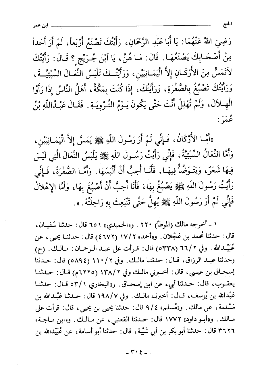 رضى الله عنهما يَا أَبَا عَبْدِ الرَّحْمَنِ رَأَيْتُكَ تَصْنَعُ أَرْبَعًا لَمْ أَرَ أَحَدًا مِنْ أَصْحَابِكَ يَصْنَعُهَا. قَالَ مَا هُنَّ يَا ابْنَ جُرَيْجٍ قَالَ رَأَيْتُكَ لَا تَمَسُّ مِنَ الأَرْكَانِ إِلَاّ الْيَمَانِيَيْنِ وَرَأَيْتُكَ تَلْبَسُ النِّعَالَ السِّبْتِيَّةَ وَرَأَيْتُكَ تَصْبُغُ بِالصُّفْرَةِ وَرَأَيْتُكَ إِذَا كُنْتَ بِمَكَّةَ أَهَلَّ النَّاسُ إِذَا رَأَوُا الْهِلَالَ وَلَمْ تُهْلِلْ أَنْتَ حَتَّى يَكُونَ يَوْمُ التَّرْوِيَةِ. فَقَالَ عَبْدُ اللَّهِ بْنُ عُمَرَ: