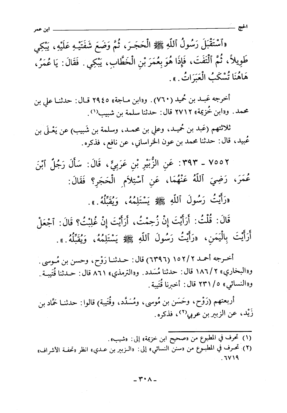 ٧٥٥٢ - عَنِ الزُّبَيْرِ بْنِ عَرَبِىٍّ قَالَ سَأَلَ رَجُلٌ ابْنَ عُمَرَ - رضى الله عنهما - عَنِ اسْتِلَامِ الْحَجَرِ. فَقَالَ: