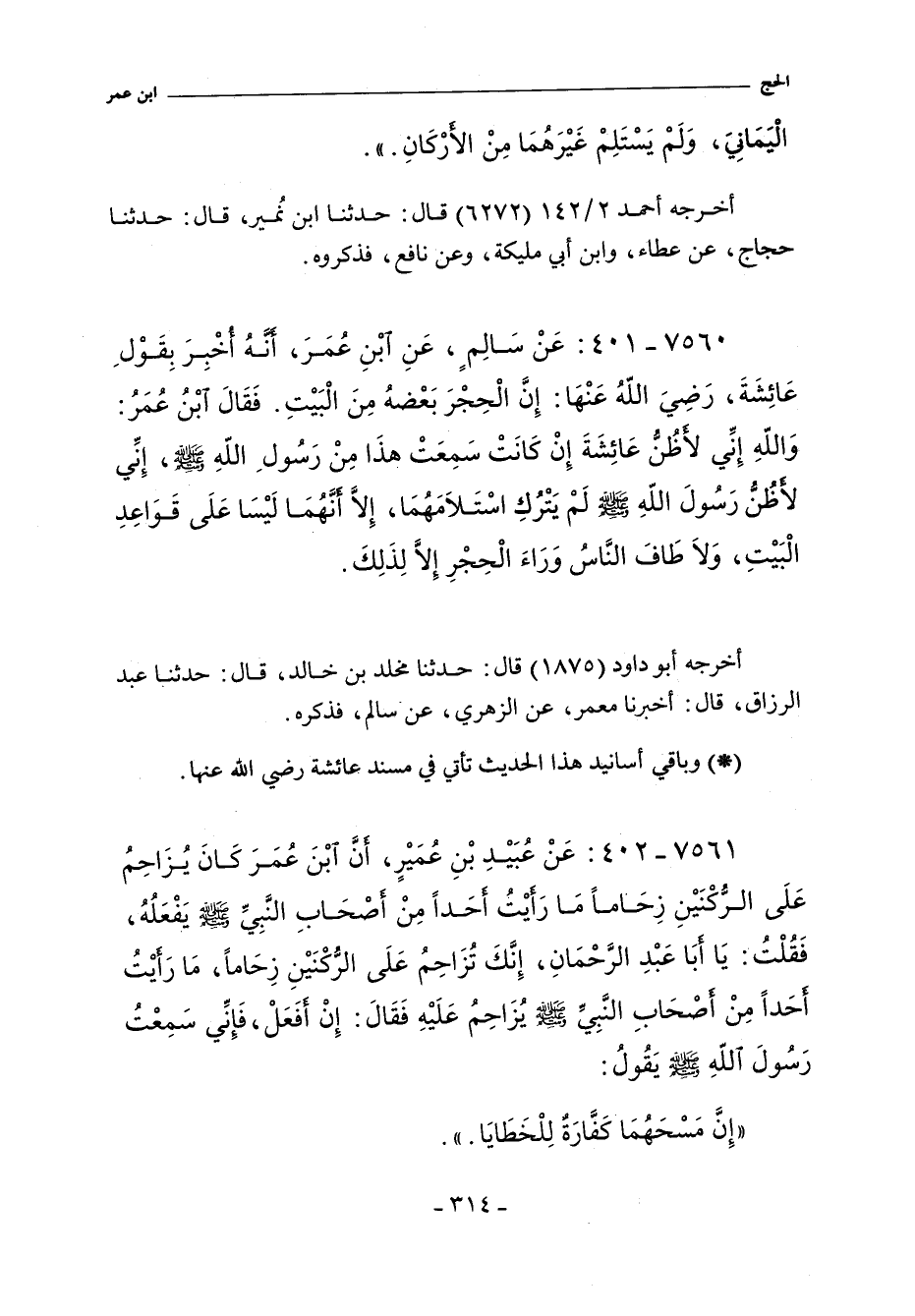 ٧٥٦٠ - عن سَالِمٍ , عَنِ ابْنِ عُمَرَ , أَنَّهُ أُخْبِرَ بِقَوْلِ عَائِشَةَ , رَضِىَ اللَّهُ عَنْهَا: إِنَّ الْحَجَرَ بَعْضُهُ مِنَ الْبَيْتِ. فَقَالَ ابْنُ عُمَرَ: وَاللَّهِ إِنِّى لأَظُنُّ عَائِشَةَ إِنْ كَانَتْ سَمِعْتُ هَذَا مِنْ رَسُولِ اللَّهِ , صلى الله عليه وسلم , إِنِّى لأَظُنُّ رَسُولَ اللَّهِ , صلى الله عليه وسلم , لَمْ يَتْرُكِ اسْتِلَامَهُمَا , إِلَاّ أَنَّهُمَا لَيْسَا عَلَى قَوَاعِدِ الْبَيْتِ , وَلَا طَافَ النَّاسُ وَرَاءَ الْحِجْرِ إِلَاّ لِذَلِكَ.