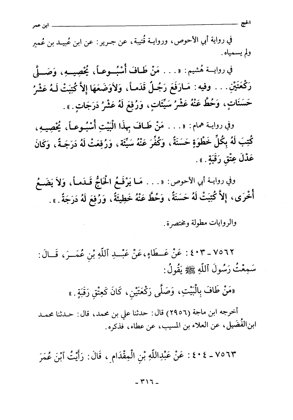 - وفي رواية: عَنْ عَبْدِ اللَّهِ بْنِ عُبَيْدِ بْنِ عُمَيْرٍ أَنَّهُ سَمِعَ أَبَاهُ يَقُولُ لاِبْنِ عُمَرَ مَا لِى لَا أَرَاكَ تَسْتَلِمُ إلَاّ هَذَيْنِ الرُّكْنَيْنِ الْحَجَرَ الأَسْوَدَ وَالْرُكْنَ الْيَمَانِىَ فَقَالَ ابْنُ عُمَرَ إِنْ أَفْعَلْ فَقَدْ سَمِعْتُ رَسُولَ اللَّهِ صلى الله عليه وسلم يَقُولُ إِنَّ اسْتِلامَهُمَا يَحُطُّ الْخَطَايَا قَالَ وَسَمِعْتُهُ يَقُولُ مَنْ طَافَ أُسْبُوعًا يُحْصِيهِ وَصَلَّى رَكْعَتَيْنِ كَانَ لَهُ كَعِدْلِ رَقَبَةٍ قَالَ وَسَمِعْتُهُ يَقُولُ مَا رَفَعَ رَجُلٌ قَدَمًا وَلَا وَضَعَهَا إلا كُتِبَ لَهُ عَشْرُ حَسَنَاتٍ وَحُطَّ عَنْهُ عَشْرُ سَيِّئَاتٍ وَرُفِعَ لَهُ عَشْرُ دَرَجَاتٍ.