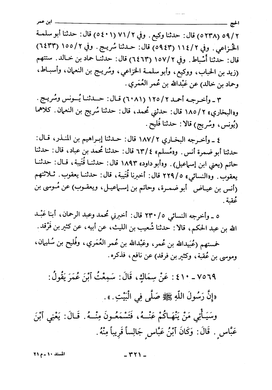 ٢/ ٥٩ (٥٢٣٨) قال: حدَّثنا وكيع، عن العمري. وفي ٢/ ٧١ (٥٤٠١) قال: حدَّثنا أبو سلمة الخزاعي، أخبرنا عبد الله بن عمر. وفي ٢/ ٧٥ (٥٤٤٤) قال: حدثنا عفان، حدثنا وهيب، حدثنا عبيد الله بن عمر. وفي ٢/ ٩٨ (٥٧٣٧) قال: حدثنا علي بن بَحْر، حدثنا عيسى بن يونس، عن عبيد الله. وفي ٢/ ١٠٠ (٥٧٦٠) قال: حدثنا عفان، حدثنا سُليم بن أخضر، حدثنا عبيد الله. وفي ٢/ ١١٤ (٥٩٤٣) قال: حدَّثنا سريج، حدثنا عبد الله. وفي ٢/ ١٢٣ (٦٠٤٧) قال: حدثنا أبو نوح، أخبرنا عبيد الله. وفي ٢/ ١٢٥ (٦٠٨١) قال: حدَّثنا يونس، وسريج، حدثنا فليح. وفي ٢/ ١٥٥ (٦٤٣٣) قال: حدَّثنا أسباط، حدثنا عبد الله بن عمر. وفي ٢/ ١٥٧ (٦٤٦٣) قال: حدَّثنا حماد بن خالد، حدثنا عبد الله. و"الدارِمِي" ١٨٤١ قال: حدثنا عبد الله بن سعيد، حدثنا عُقبة بن خالد، حدثنا عبيد الله. وفي (١٨٤٢) قال: حدَّثنا عبد الله بن عمر بن أبان، حدثنا عبد الله بن المبارك، أخبرنا عبيد الله بن عمر. و"البُخَارِي" ٢/ ١٨٥ (١٦٠٤) قال: حدَّثني مُحَمَّد، حدثنا سريج بن النعمان، حدثنا فليح. قال البخاري عقبه: تابعه الليث. قال: حدَّثني كثير بن فرقد. وفي ٢/ ١٨٧ (١٦١٦) قال: حدثنا إبراهيم بن المنذر، حدثنا أبو ضمرة أنس، حدثنا موسى بن عقبة. وفي (١٦١٧) قال: حدَّثنا إبراهيم بن المنذر، حدثنا أنس بن عِياض، عن عبيد الله. وفي ٢/ ١٩٤ (١٦٤٤) قال: حدثنا مُحَمَّد بن عُبيد بن ميمون، حدثنا عيسى بن يونس. و"مسلم" ٤/ ٦٣ (٣٠٢٣) قال: حدثنا أبو بكر بن أبي شَيْبة، حدثنا عبد الله بن نُمَيْر (ح) وحدثنا ابن نُمَيْر، حدثنا أبي، حدثنا عبيد الله. وفي (٣٠٢٤) قال: وحدثنا مُحَمَّد بن عباد، حدثنا حاتم، يعني ابن إسماعيل