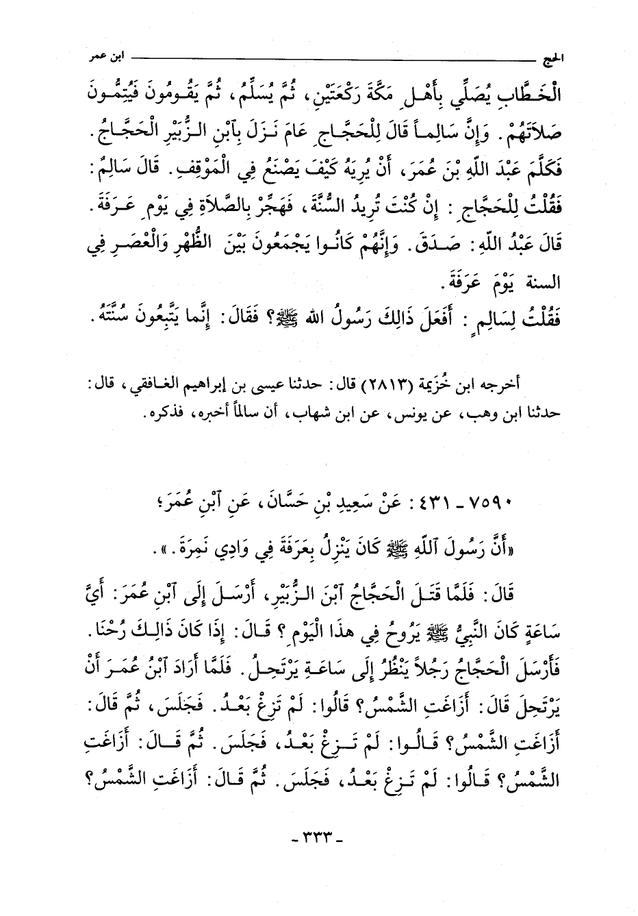 الْخَطَّابِ يُصَلِّي بِأَهْلِ مَكَّةَ رَكْعَتَيْنِ , ثَمَّ يَقُومُونَ فَيُتِمُّونَ صَلَاتَهُمْ , وَإِنَّ سَالِمًا قَالَ لِلْحَجَّاجَ , عَامَ نَزَلَ بِابْنِ الزُّبَيْرِ الْحَجَّاجُ , فَكَلَّمَ عَبْدَ اللَّهِ بْنُ عُمَرَ , أَنْ يُرِيَهُ كَيْفَ يَصْنَعُ فِى الْمَوْقِفِ , قَالَ سَالِمٌ: فَقُلْتُ لِلْحَجَّاجِ: إِنْ كُنْتَ تُرِيدُ السُّنَّةَ , فَهَجِّرْ بِالصَّلَاةِ فِي يَوْمَ عَرَفَةَ. قَالَ عَبْدُ اللَّهِ: صَدَقَ. وَإِنَّهُمْ كَانُوا يَجْمَعُونَ بَيْنَ الظُّهْرِ وَالْعَصْرِ فِى السُّنَّةِ يَوْمَ عَرَفَةَ.