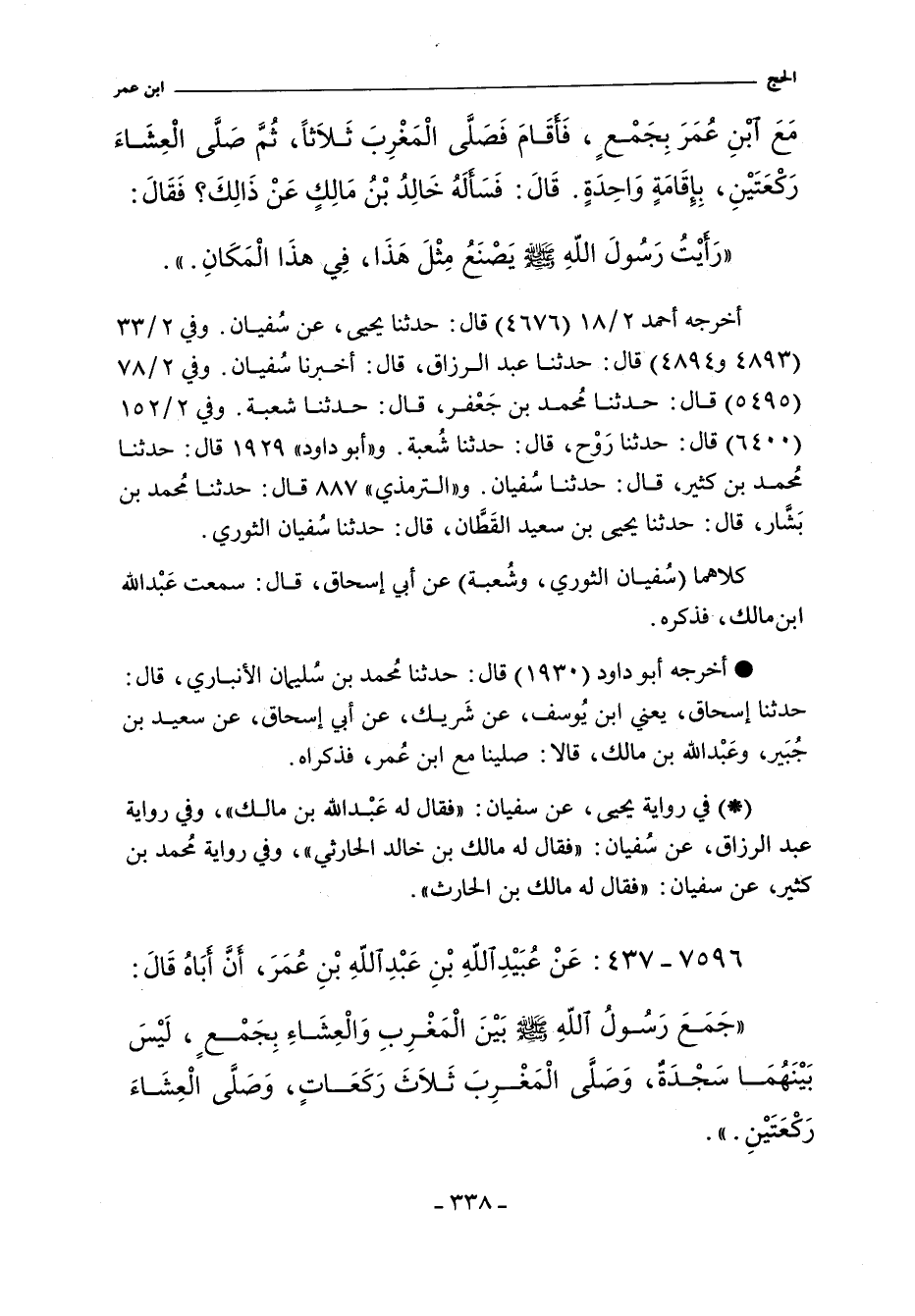 - أخرجه أبو داود (١٩٣٠) قال: حَدَّثَنَا مُحَمَّد بْنُ سُلَيْمَانَ الأَنْبَارِىُّ حَدَّثَنَا إِسْحَاقُ - يَعْنِى ابْنَ يُوسُفَ - عَنْ شَرِيكٍ عَنْ أَبِى إِسْحَاقَ عَنْ سَعِيدِ بْنِ جُبَيْرٍ وَعَبْدِ اللَّهِ بْنِ مَالِكٍ قَالَا صَلَّيْنَا مَعَ ابْنِ عُمَرَ بِالْمُزْدَلِفَةِ الْمَغْرِبَ وَالْعِشَاءَ بِإِقَامَةٍ وَاحِدَةٍ. فَذَكَرَ مَعْنَى ابْنِ كَثِيرٍ.